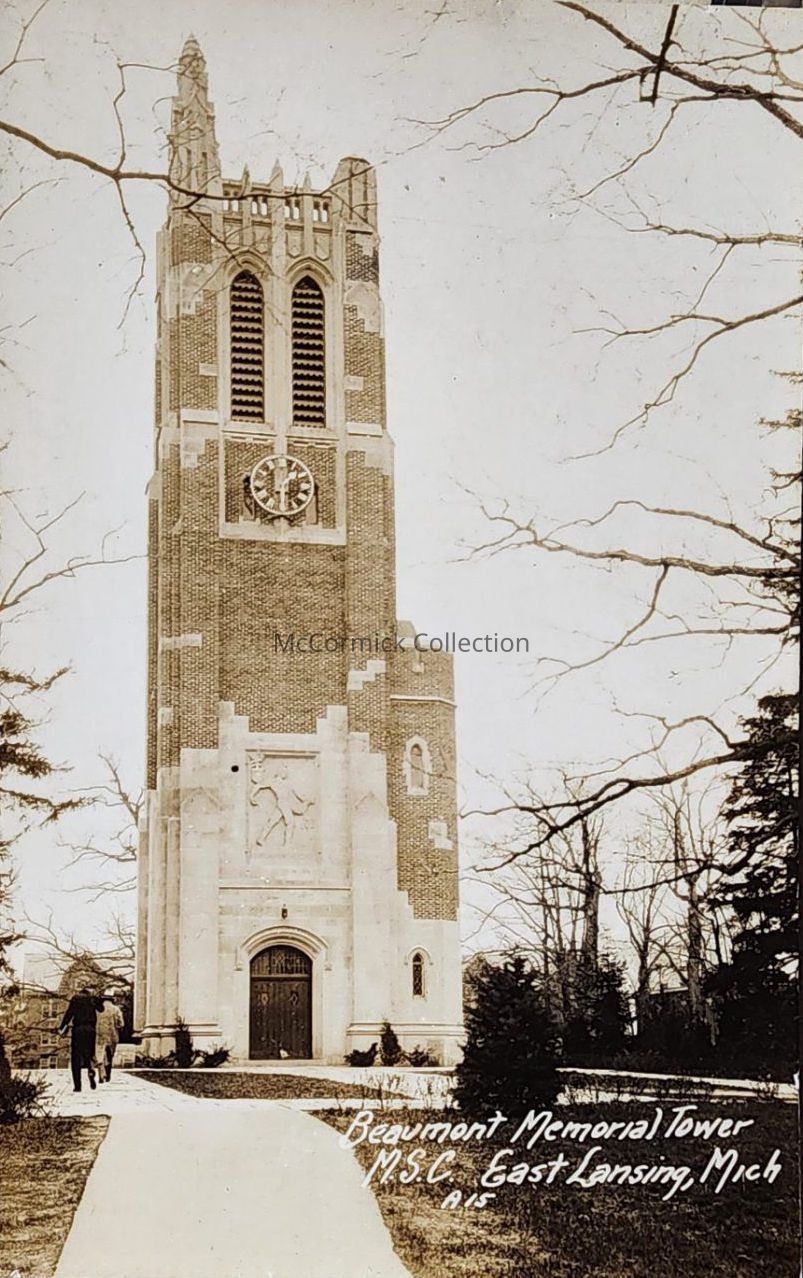 Real photo postcard of Beaumont Memorial Tower at Michigan State College. Negative number is A15.