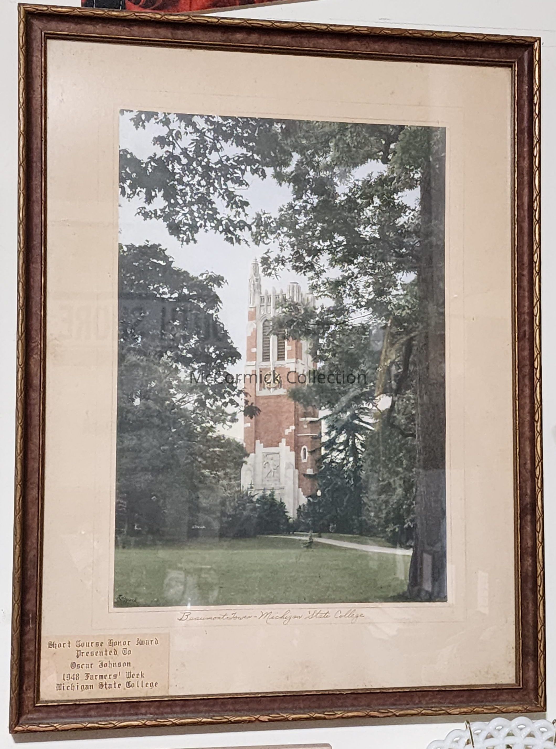 Color print of Beaumont Tower at MSU by Laycock. Presented to Oscar Johnson as a Short Course Award at Farmers' Week 1948.
