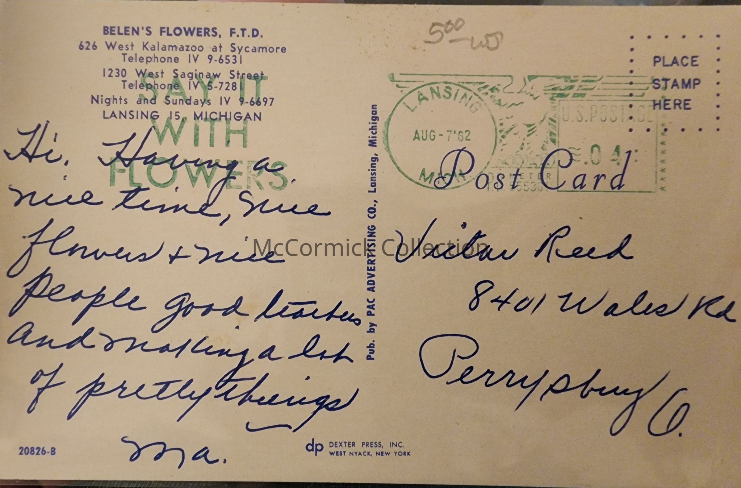 Advertising postcard for Belen's Flowers of Lansing, Michigan.