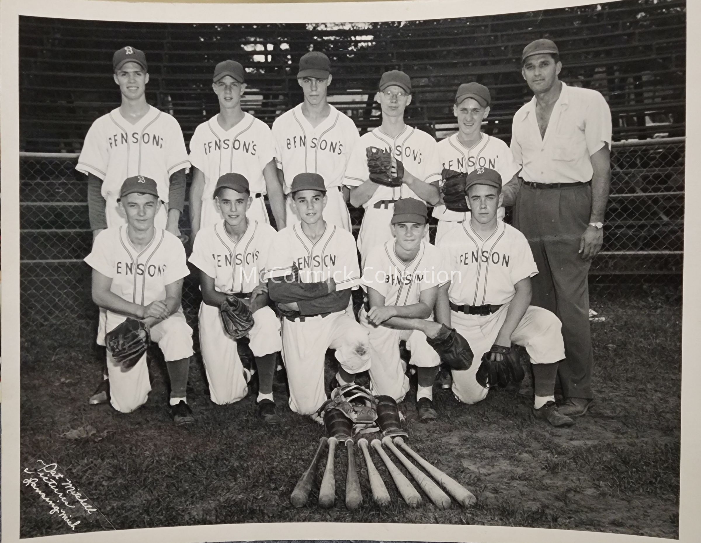Photographic print of a group of high school aged boys playing baseball for Benson's, likely Lansing league team. Photo by Lansing photographer Pat Mitchell, 1950s.