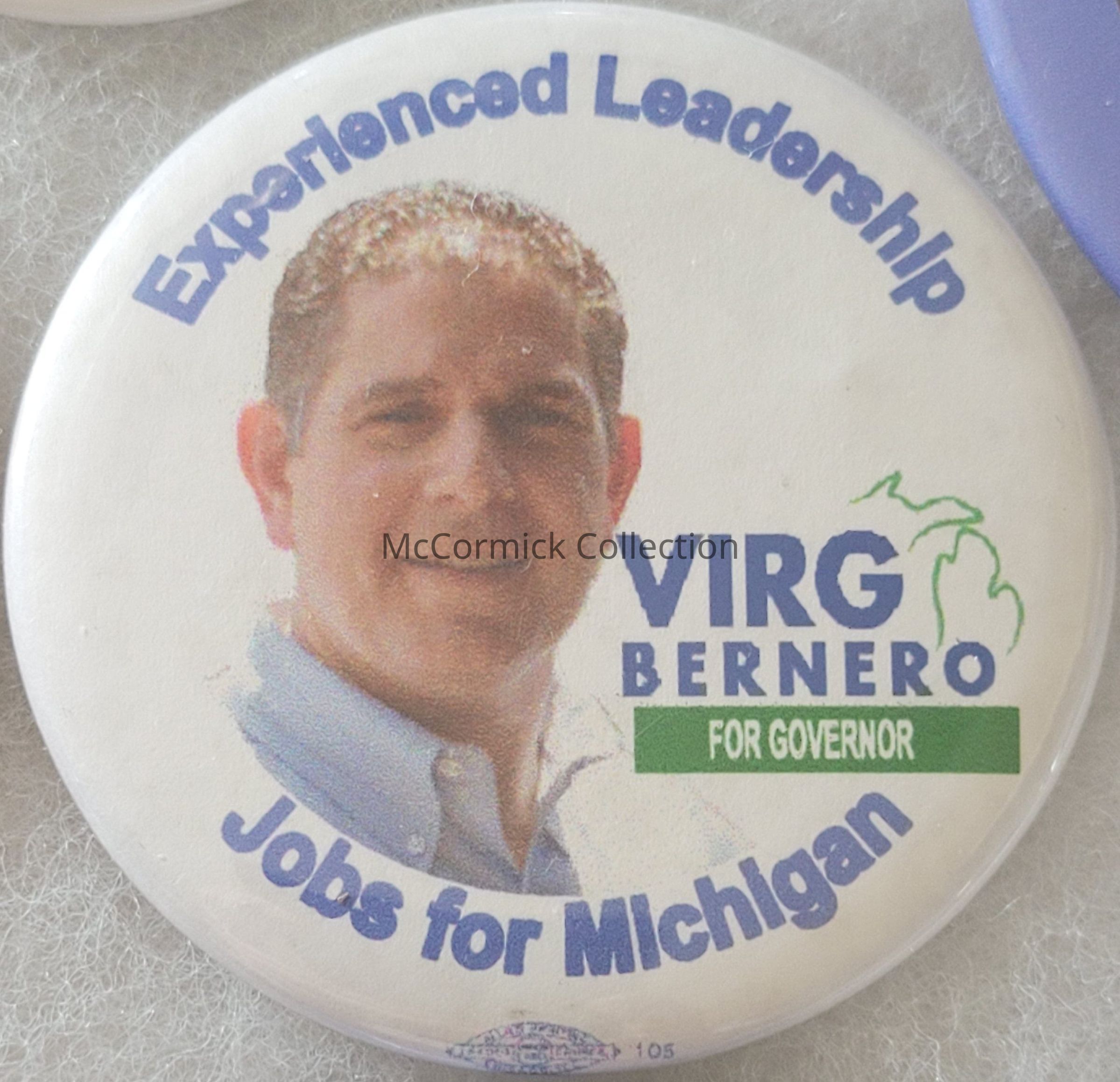 A 2.25" political button for Virg Bernero for Governor, 2010, slogan: "Experienced Leadership / Jobs for Michigan." Bernero was Mayor of Lansing.