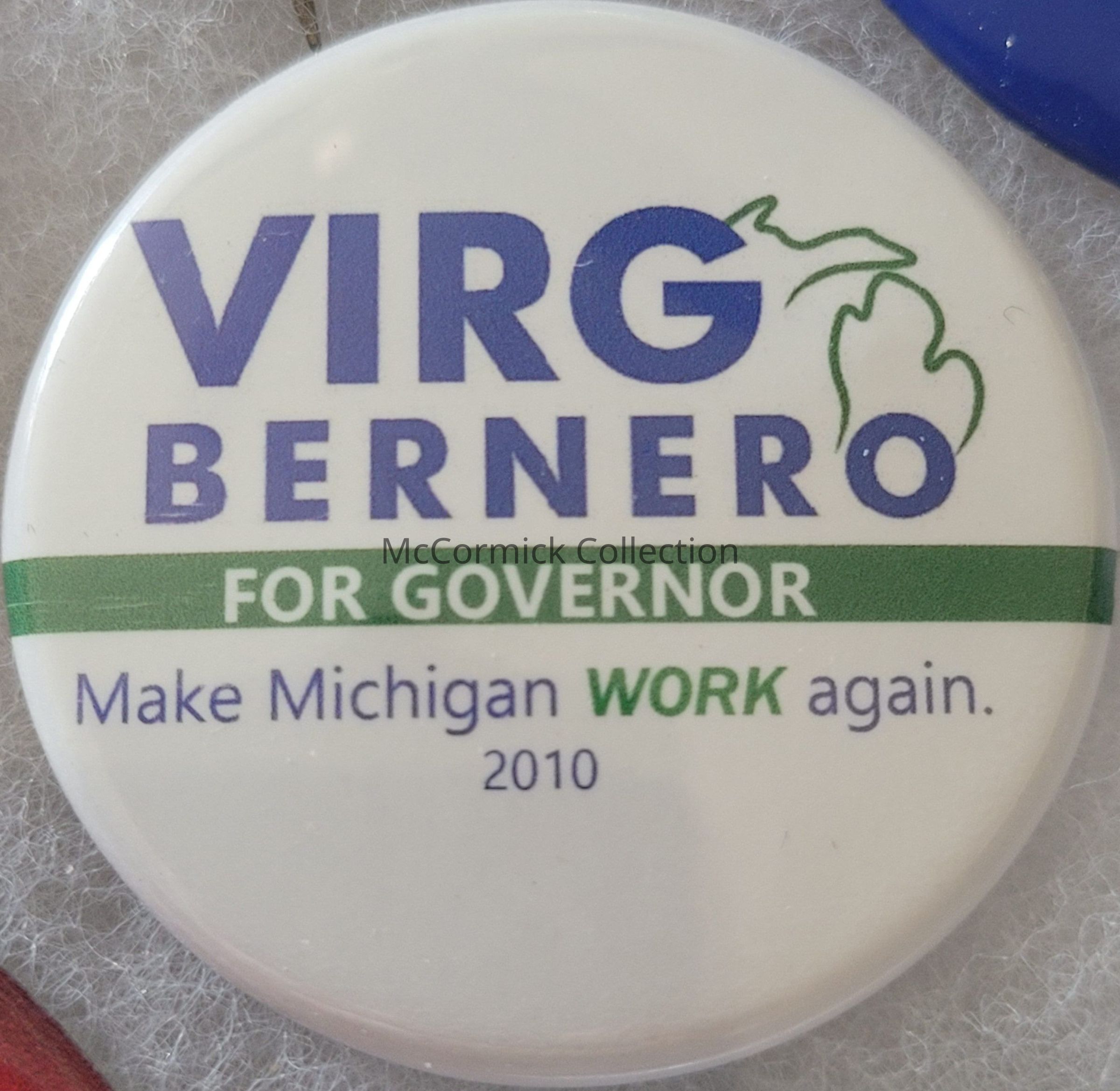 A green, blue, and white political button for Virg Bernero for Governor, 2010.