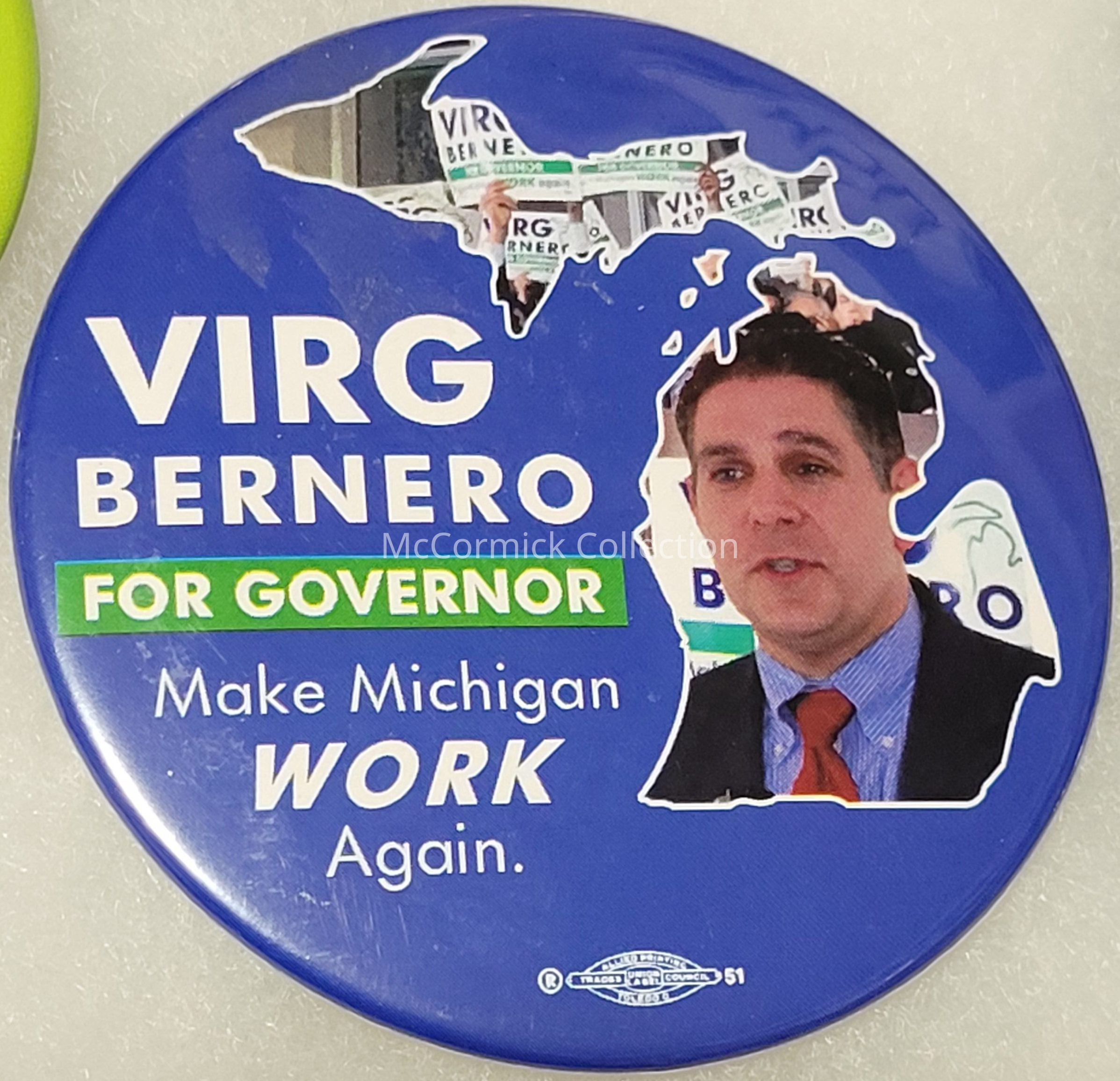 Political button, 3", for Virg Bernero for Governor of Michigan, 2010. Bernero was Mayor of Lansing at the time.