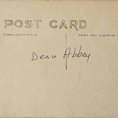 Real photo postcard of a Child, identified as Dear Abbey, sitting on a porch with toys by Lansing photographer Bovee.