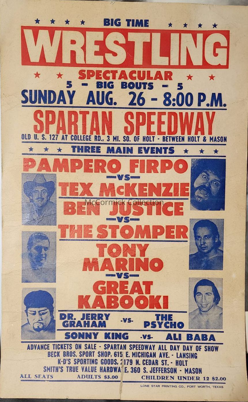 Poster, circa 1970s, from a Big Time Wrestling event at Spartan Speedway between Holt and Mason, Michigan.