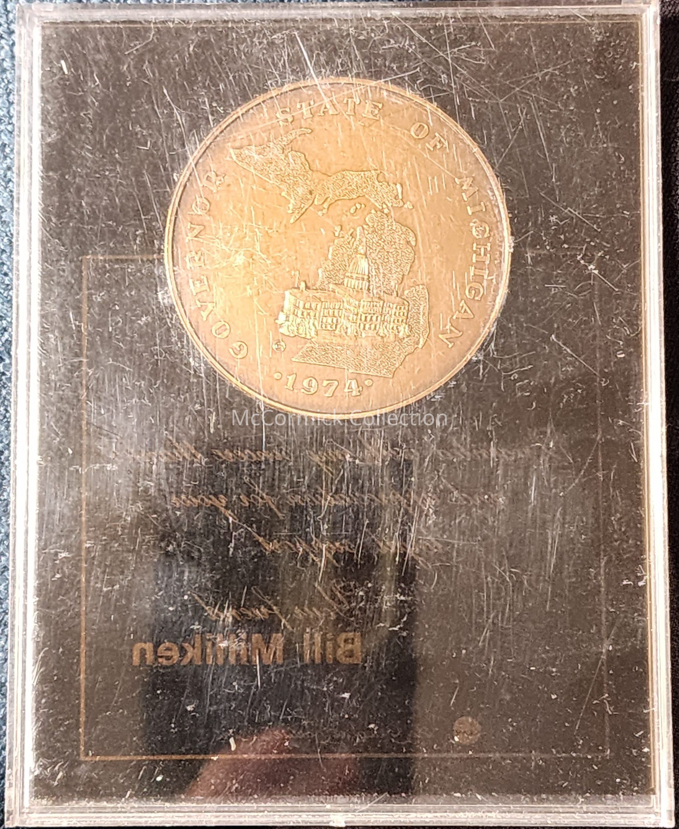 An acrylic case with a 1974 Governor William Milliken Token. The case reads: "Presented with my sincere thanks and appreciation for your loyal support. Your Friend Bill Milliken." Produced by the Jacques Carier Mint.