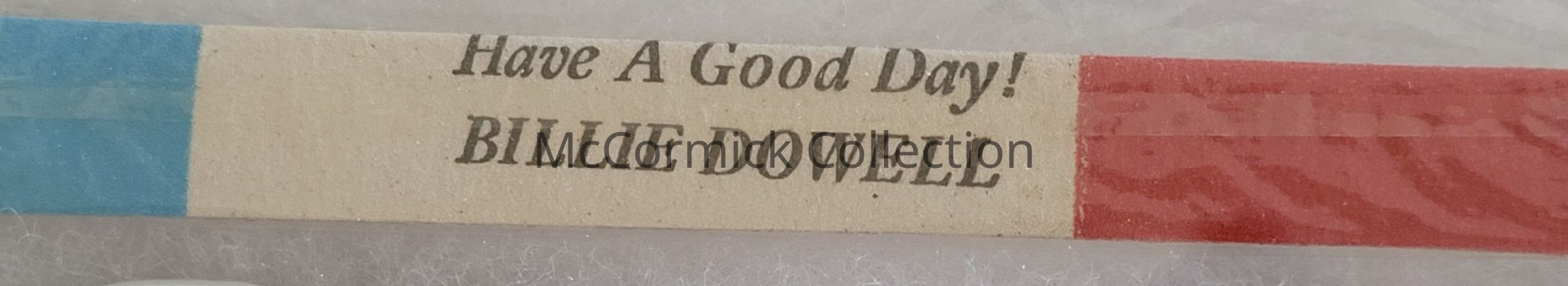 A red, white, and blue emery board for Billie Dowell either from Delhi Township clerk or supervisor campaigns (likely supervisor), circa 1970s. Dowell was the first woman to serve as Supervisor of Delhi Township, Michigan. Uses "Have a good day!" slogan.