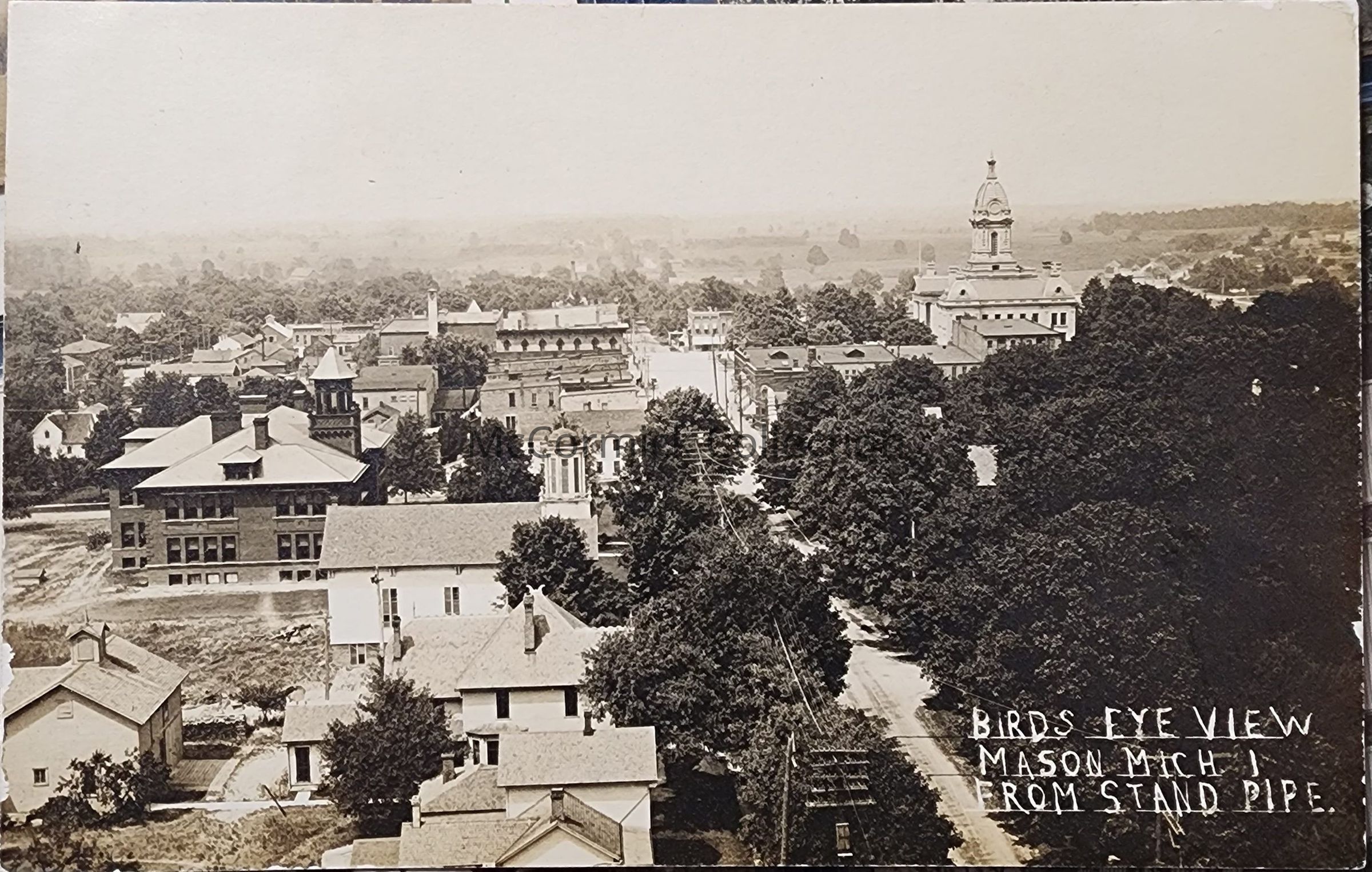 Real photo postcard of an aerial birds eye view of Mason, Michigan, showing the courthouse. Subject: Court, Courthouse, Court House