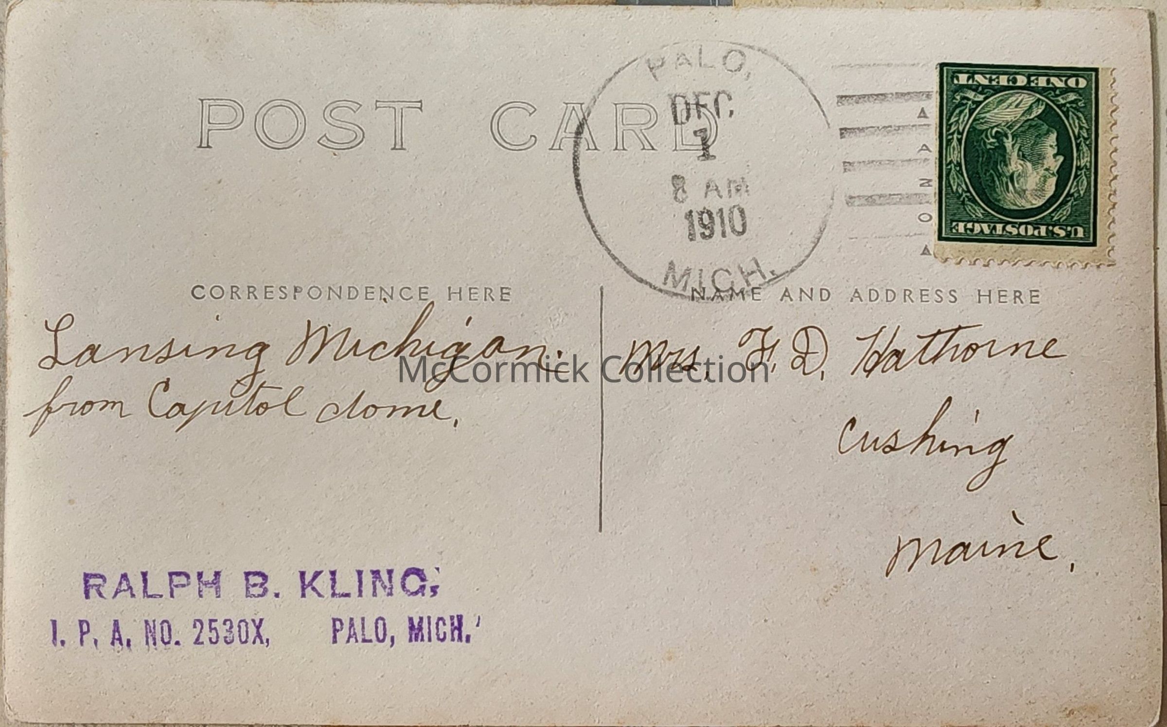 Real photo postcard taken from the Capitol dome of a birds eye view of Downtown Lansing facing northeast. Shows Lansing City Hall, Post Office, and others. Postally used, 1910 Palo. Mich., postmark.