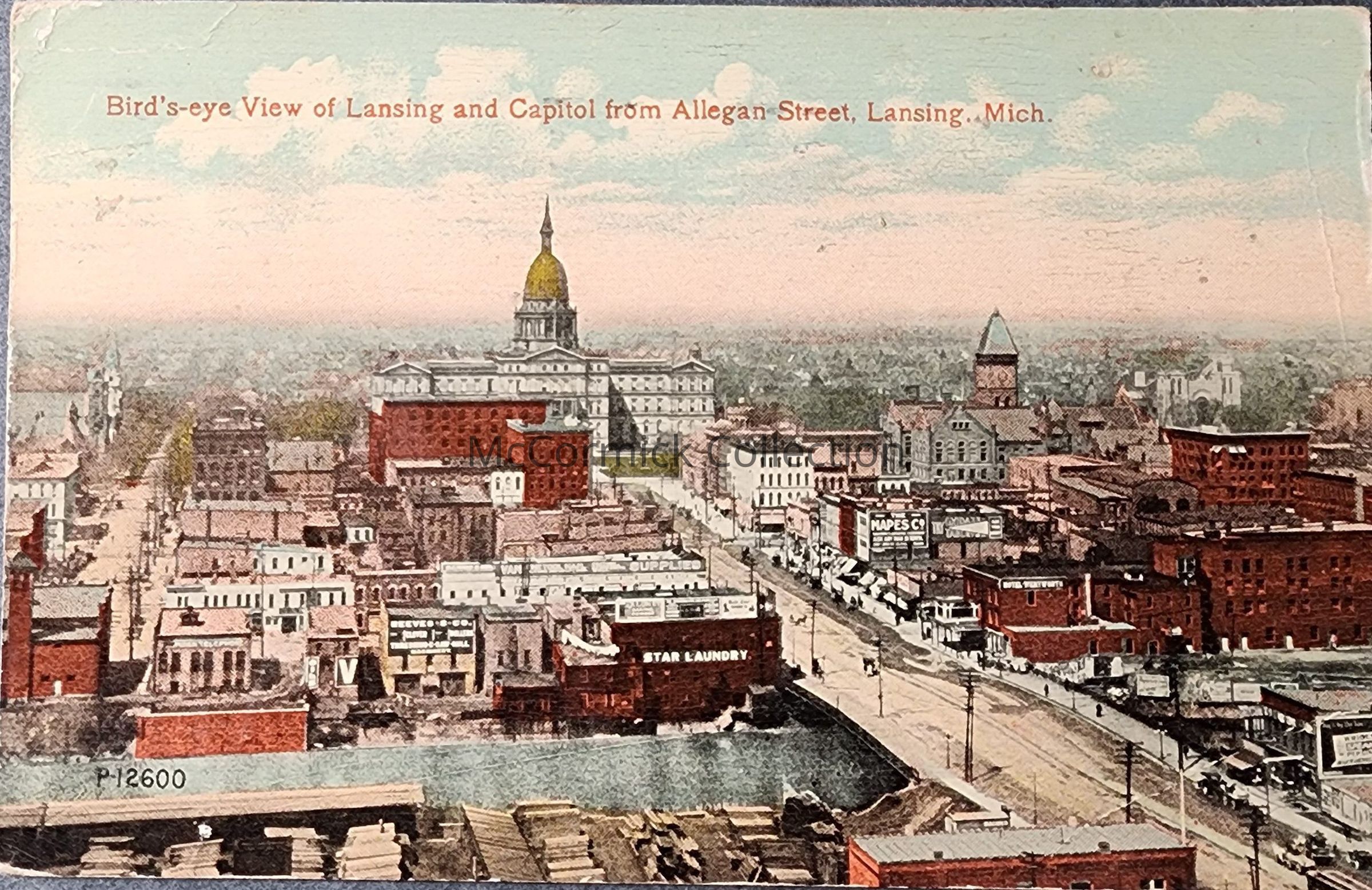 Bird's-eye View of Lansing and Capitol from Allegan Street, Lansing, Mich., Postcard