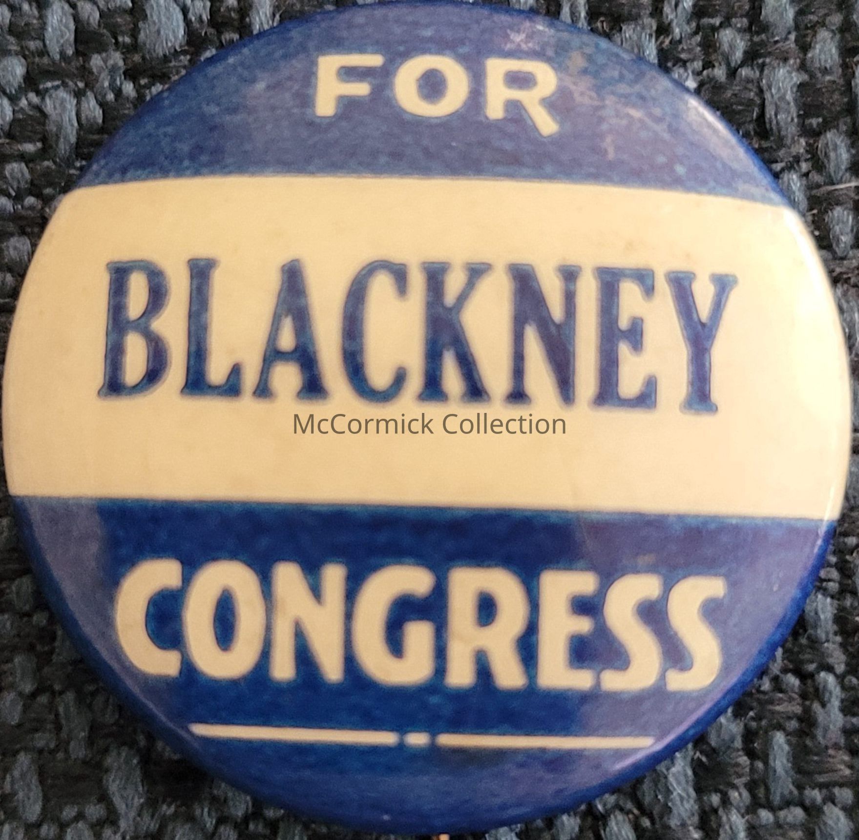 A 1" blue and white political button for William Blackney for Congress, circa 1930s.