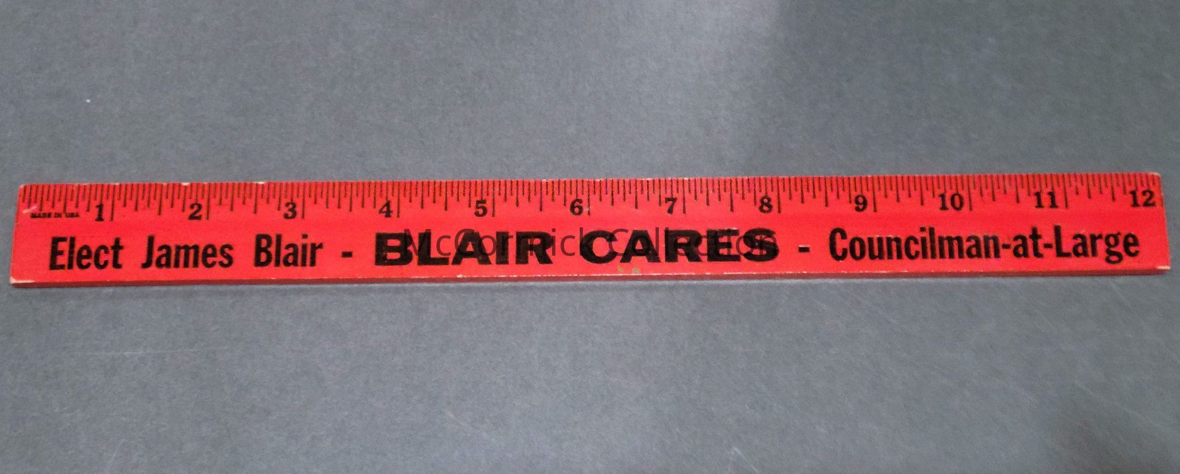 A black and red wood ruler: "Elect James Blair - Blair Cares - Councilman-at-Large," Lansing City Council.