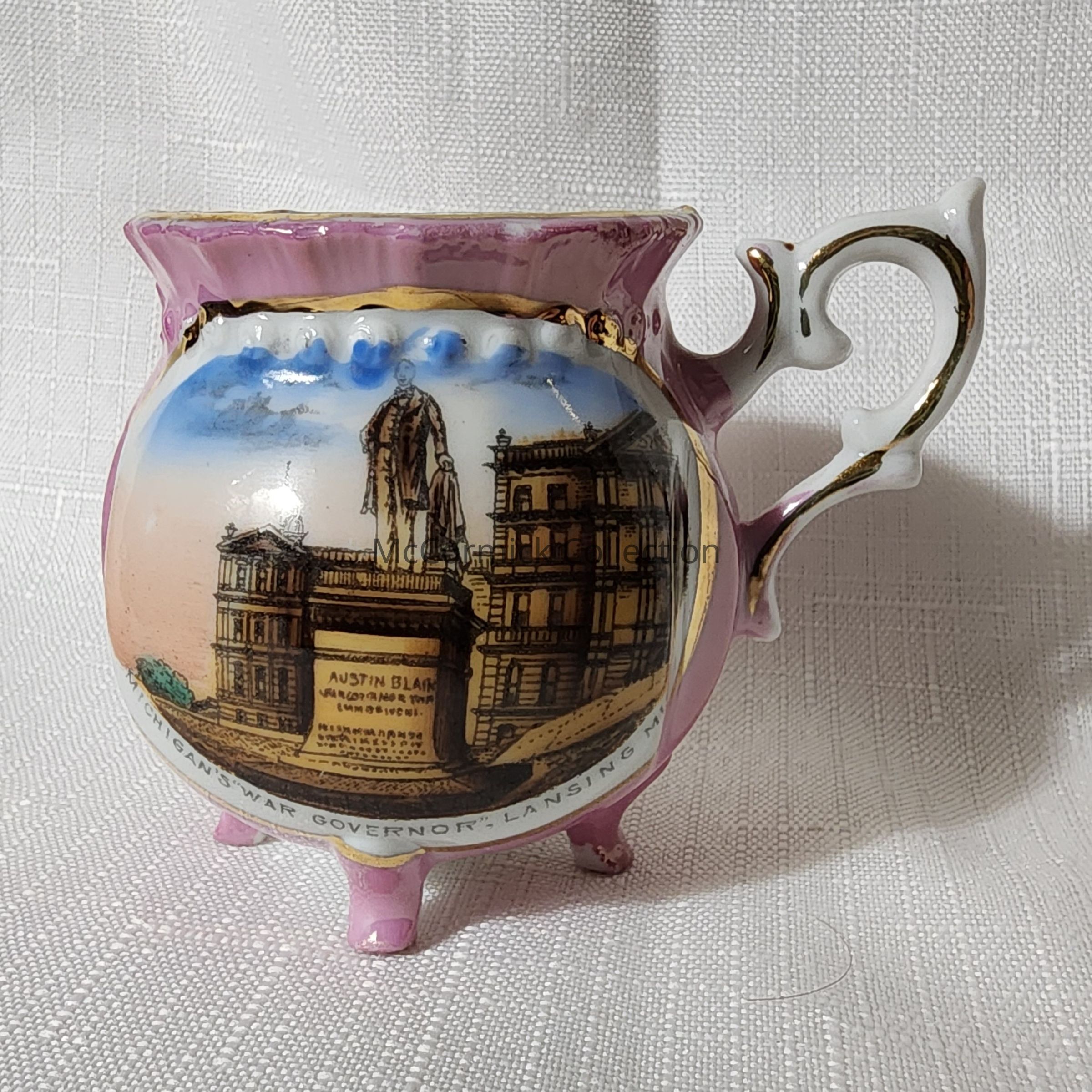 Porcelain souvenir cup of the Governor Austin Blair Monument at the Michigan State Capitol in Lansing.