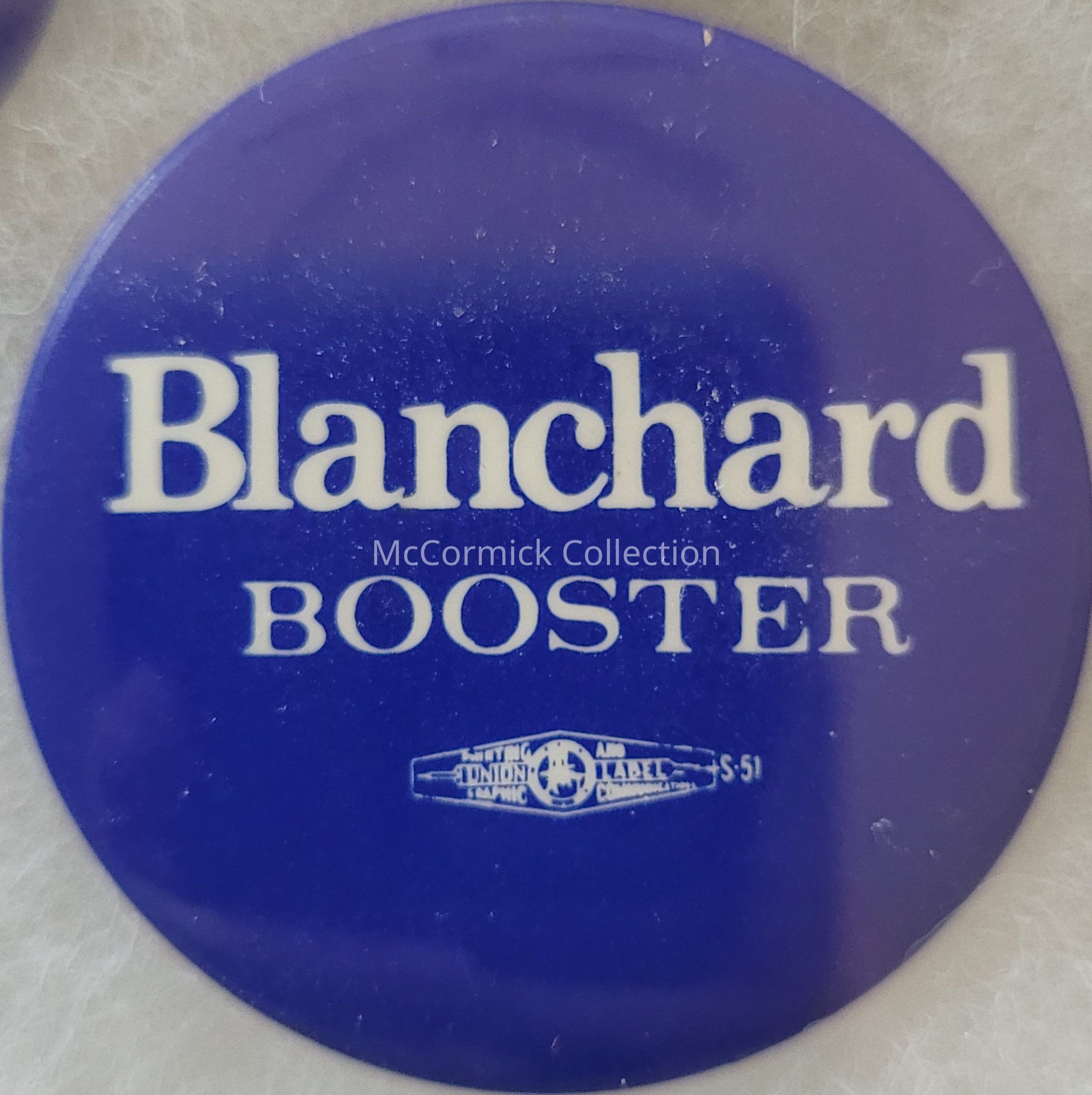 A 1.75" blue and white political button for supporters of James Blanchard for Governor; "Blanchard Booster," 1980s.