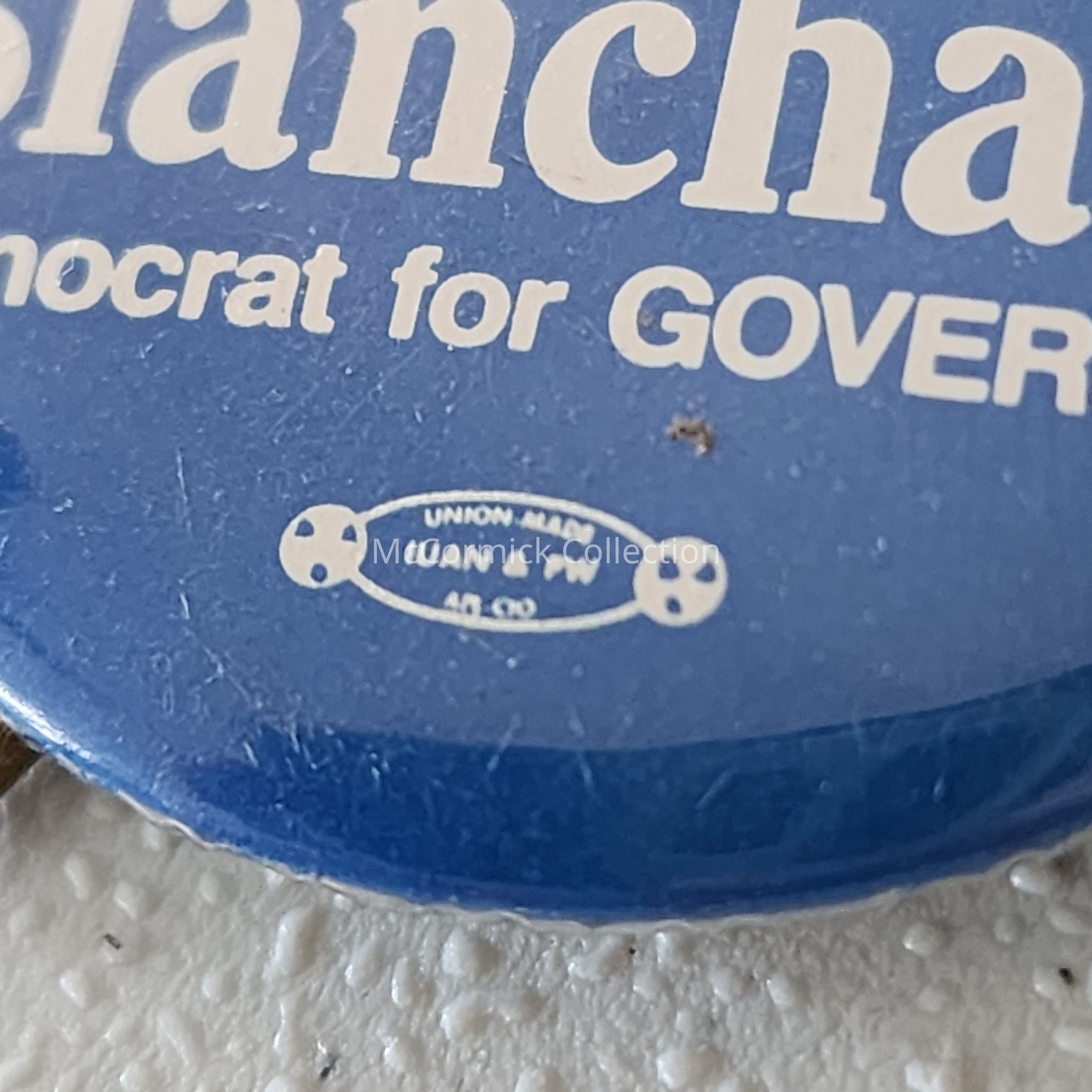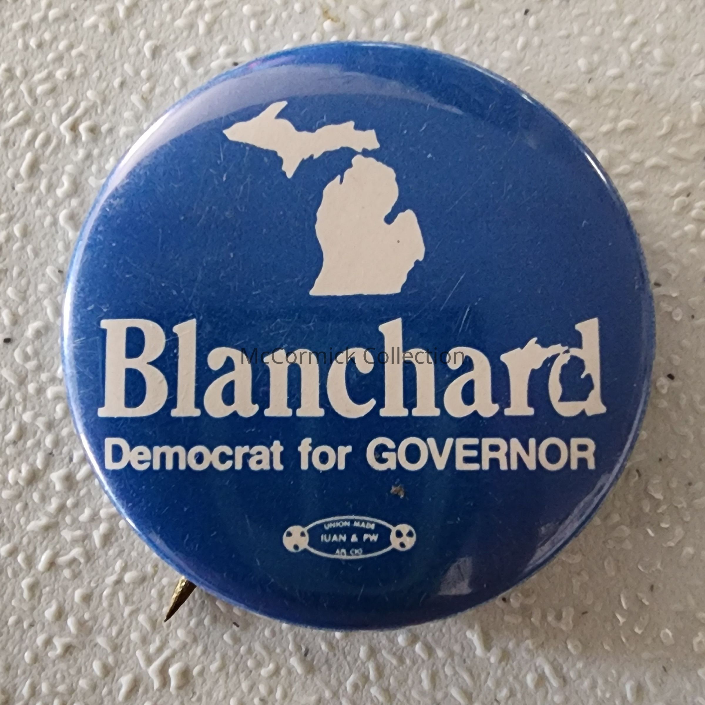 A 1.5" blue and white political button for James Blanchard for Governor of Michigan, 1980s. IUAN & FW AFL-CIO union bug.
