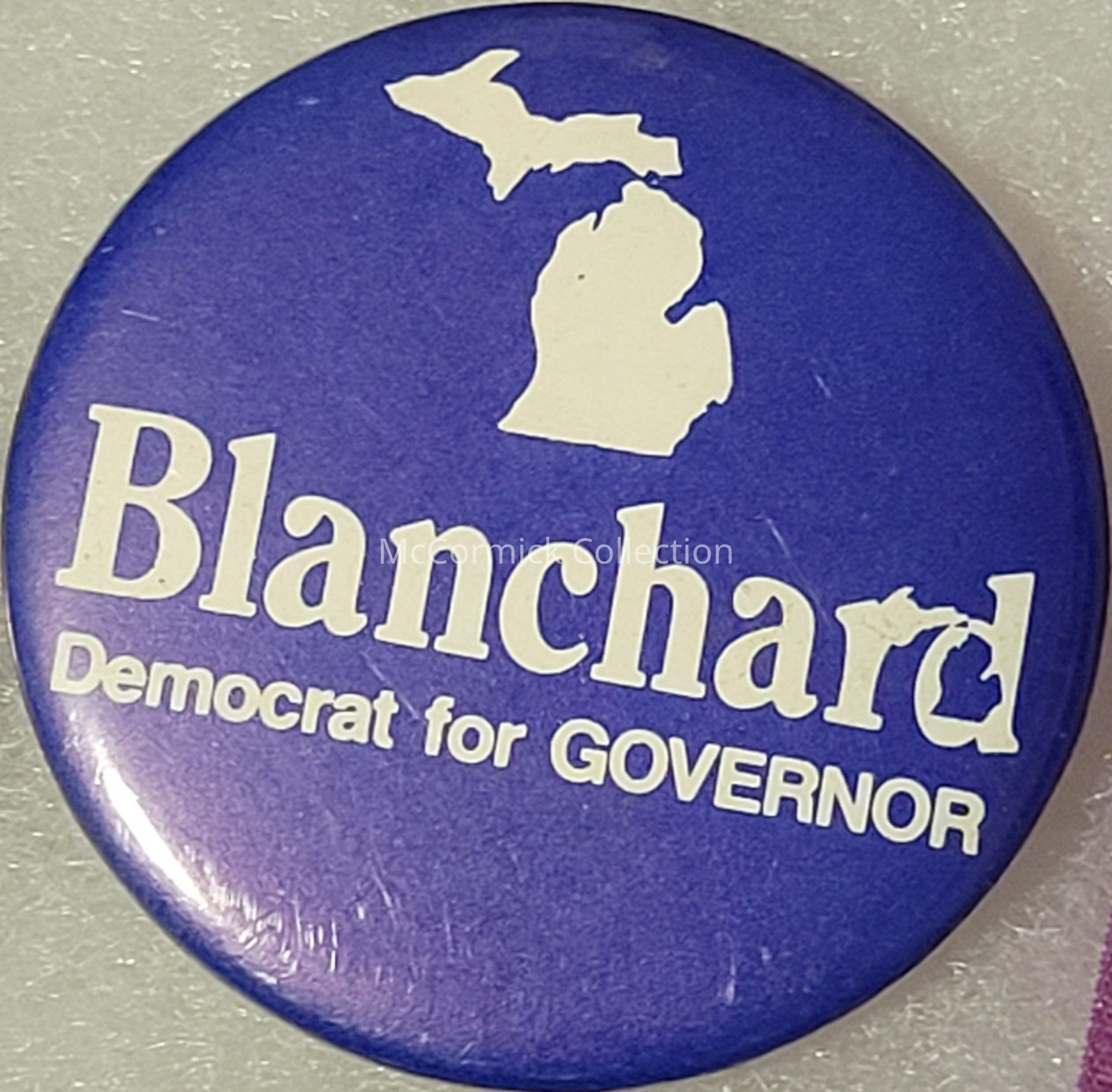 A 1.75" circa 1980s blue and white political button for James Blanchard for Governor of Michigan.