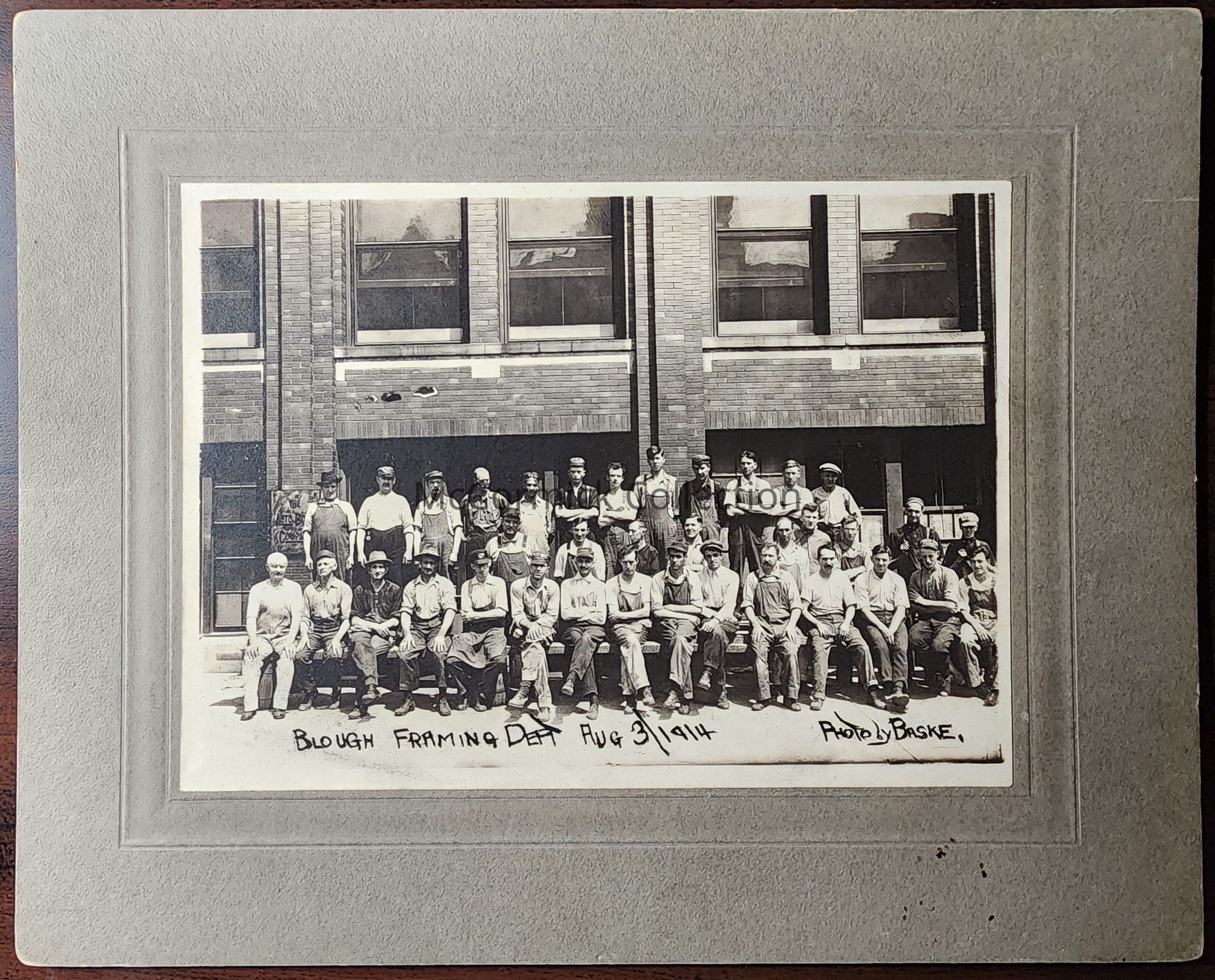Card mounted photograph of Blough Framing Department, August 3, 1914, by Lansing photographer Baske.