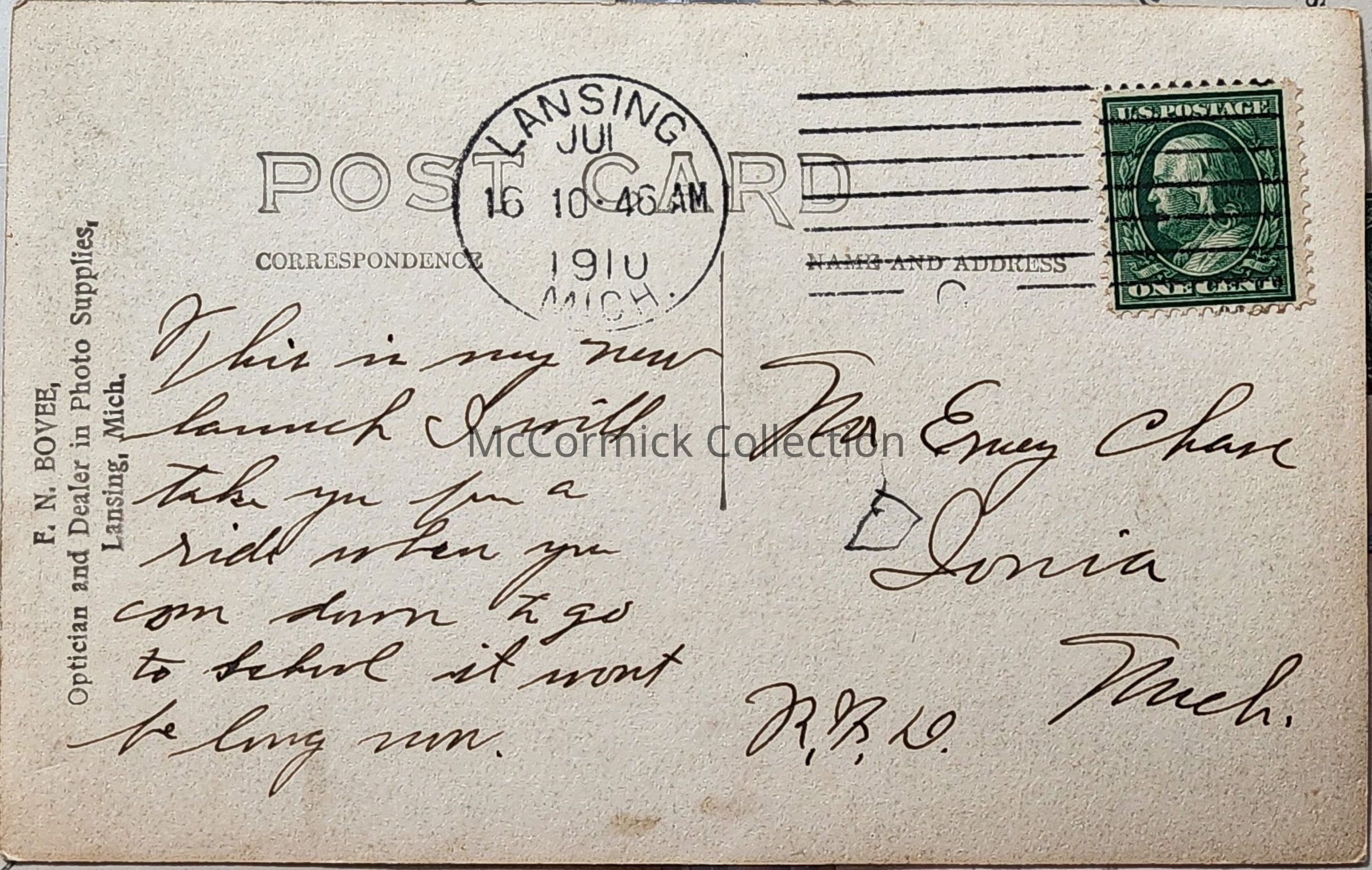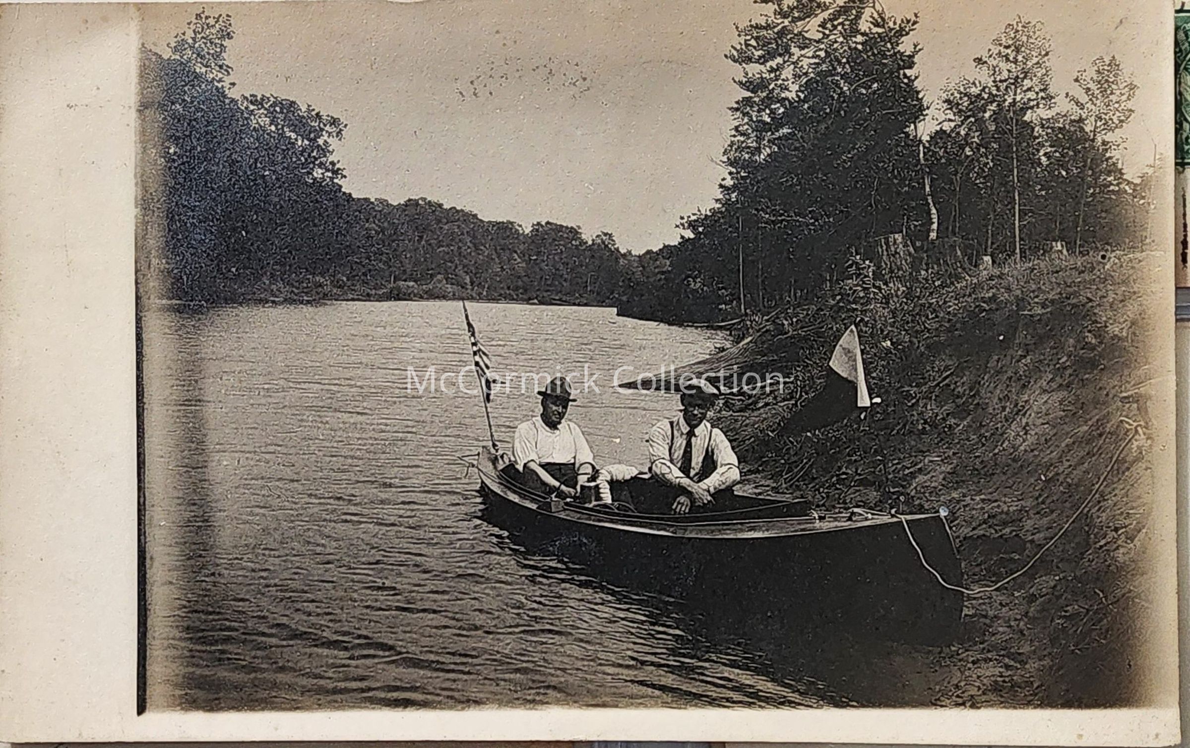 Real photo postcard of boaters on a river in Lansing. Postally used, 1910 Lansing postmark. By Lansing photographer Bovee.