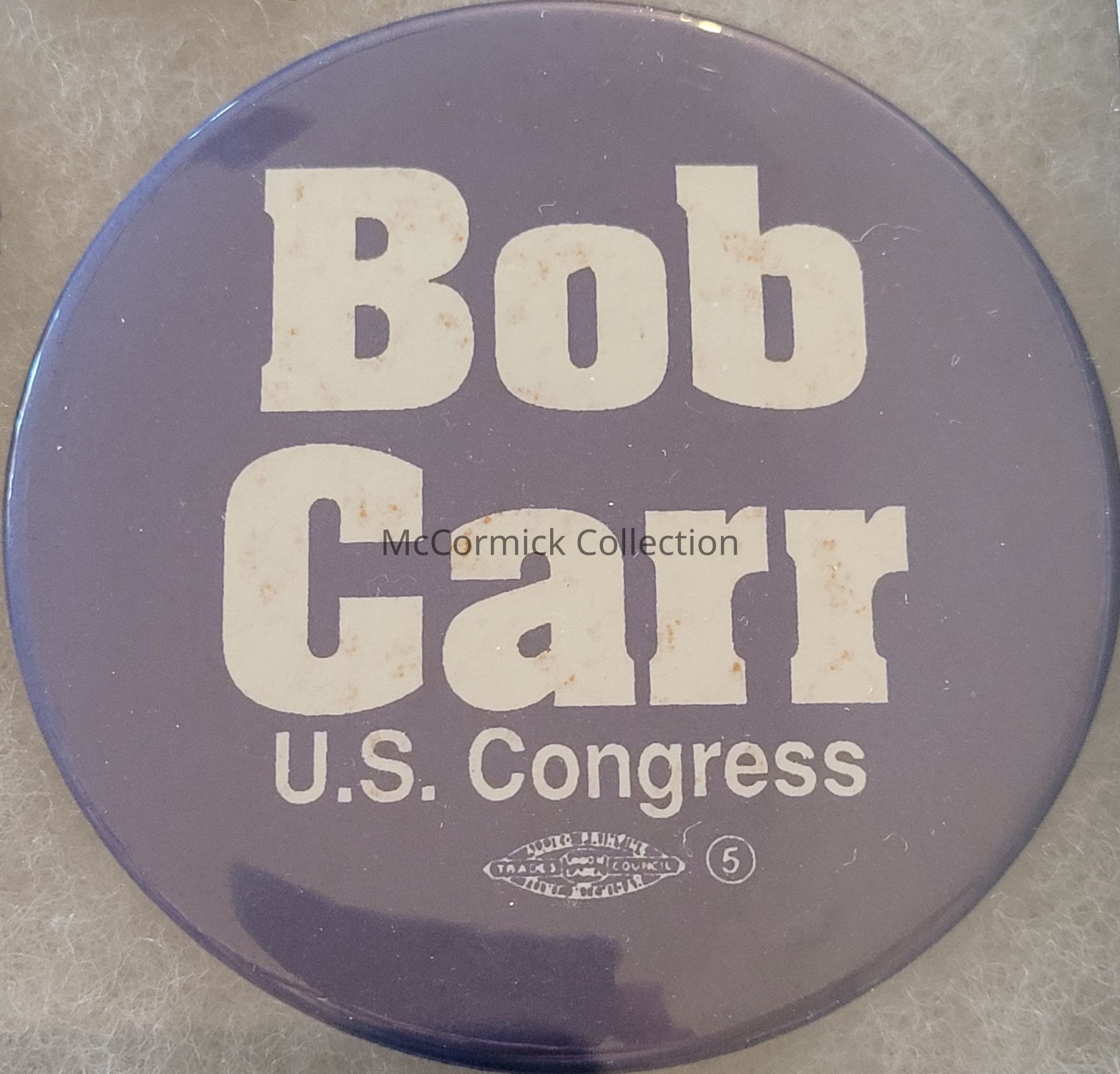 A 3" blue and white political button for Bob Carr for U.S. Congress, circa 1980s.
