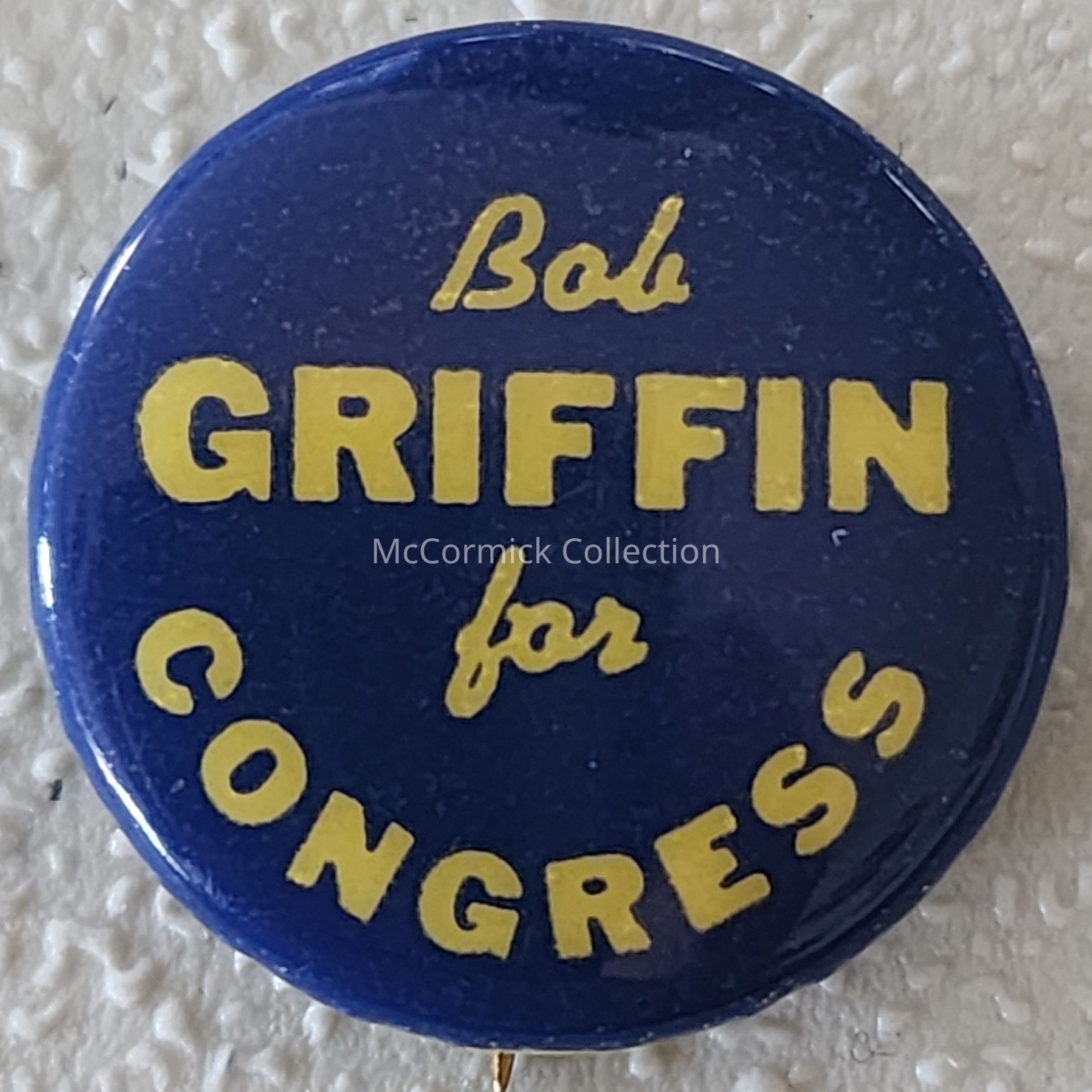 A small 7/8" blue and white/yellow political button for Bob Griffin for Congress.