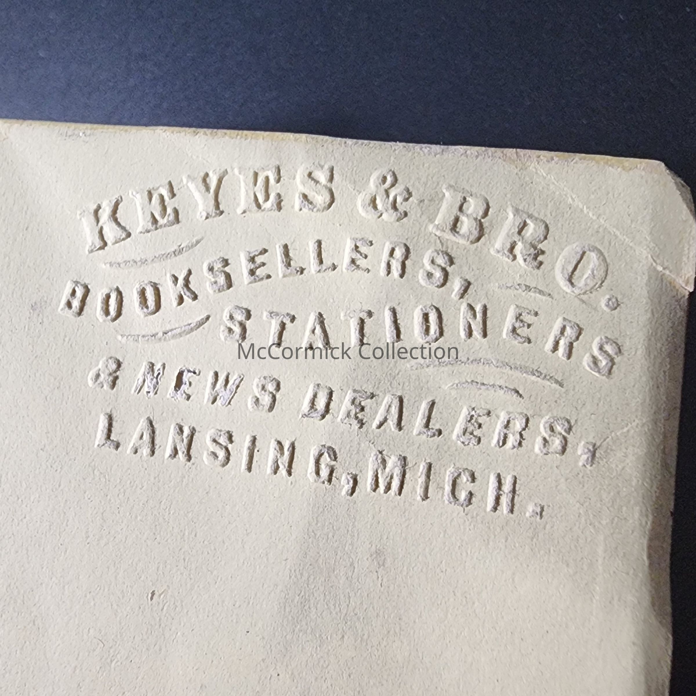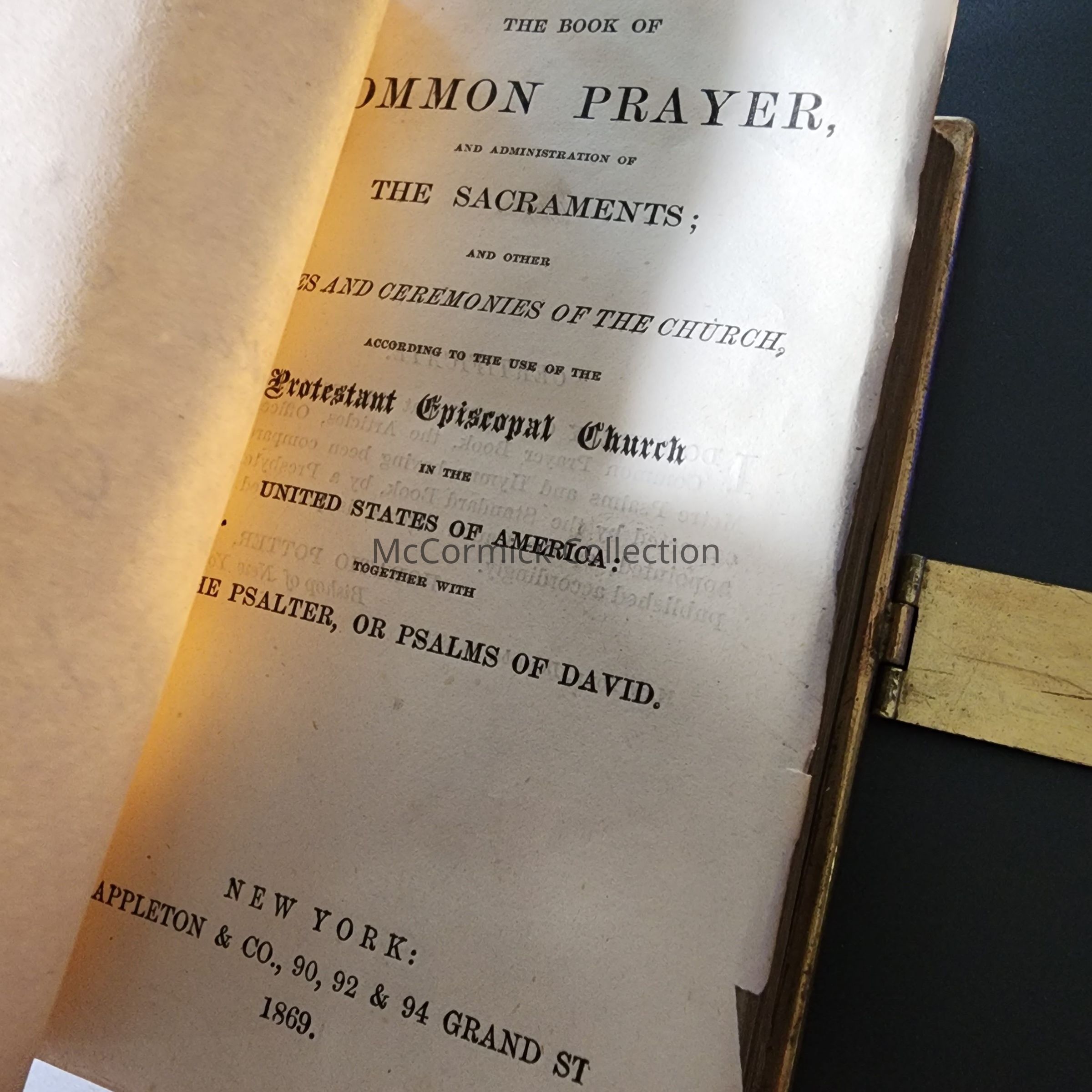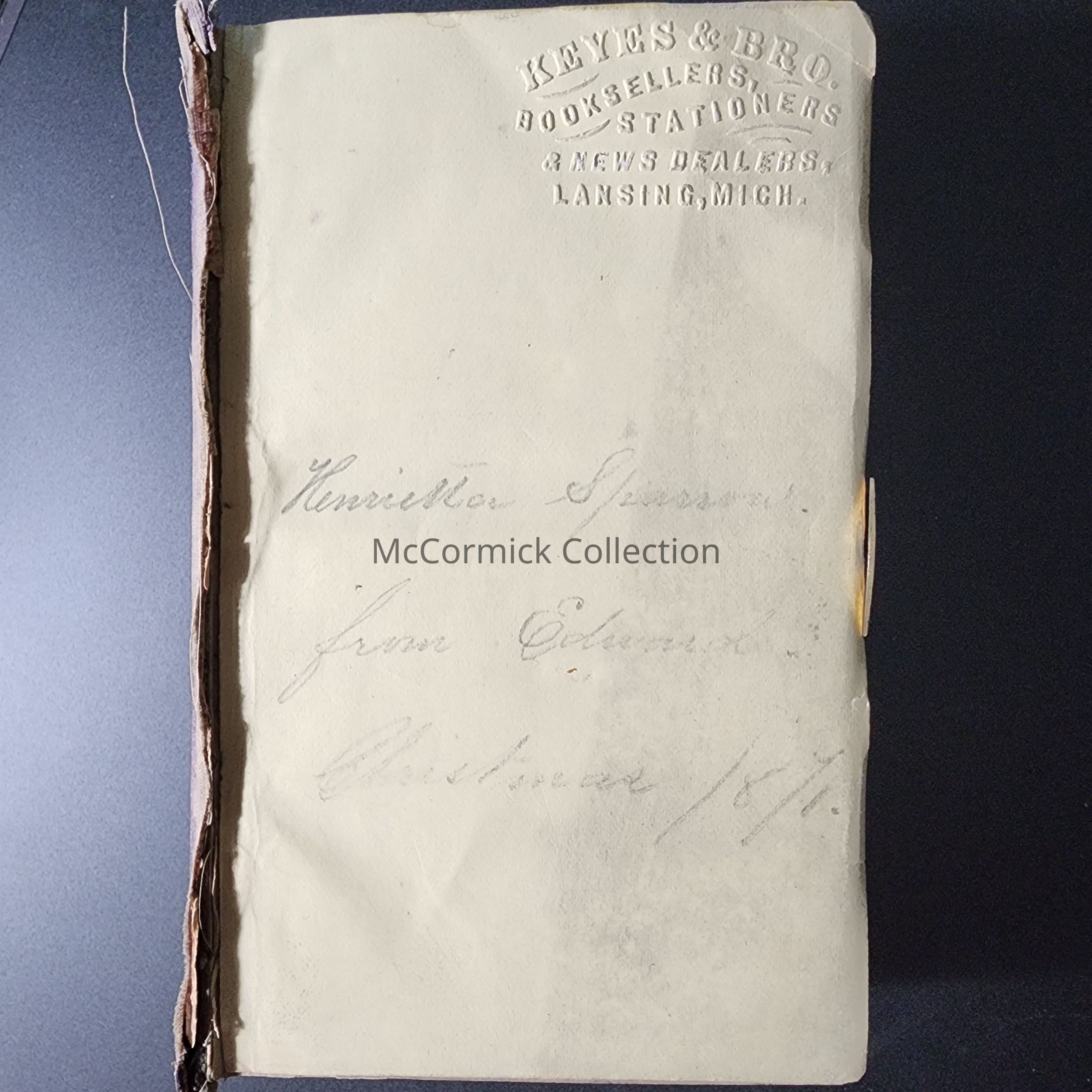 "The Book of Common Prayer" from 1869. Blind stamped by "Keyes & Bros. Booksellers, Stationers & News Dealers, Lansing, Mich." Inscribed "Henrietta Sparrow from Edward, Christmas 1871." Missing its cover.