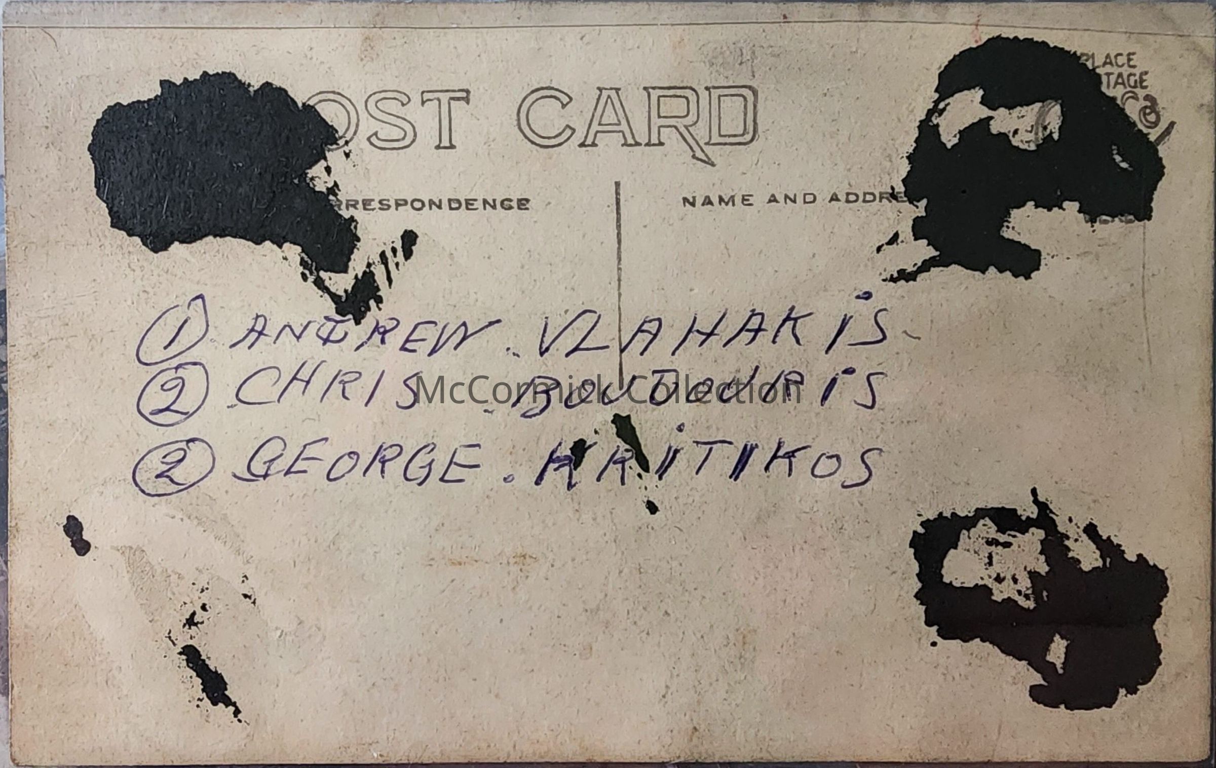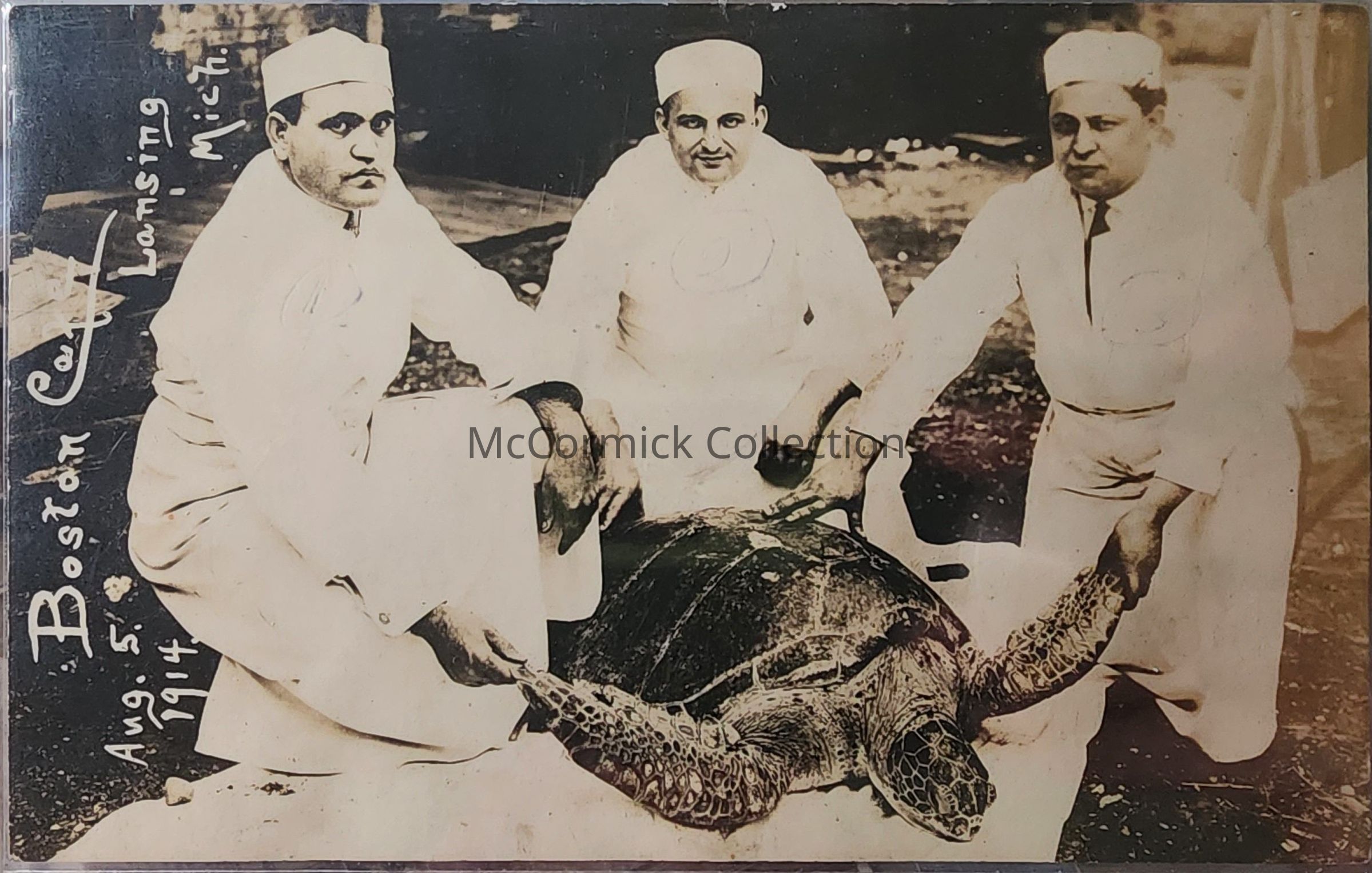 Real photo postcard of three men from the Boston Cafe in Lansing. Ancestral restaurant to Jim's Tiffany. Pictured, left to right are: Andrew Vlahakis, Chris Boutouris (sp), and George Kritikos (sp). Postally unused. Removed from an album.