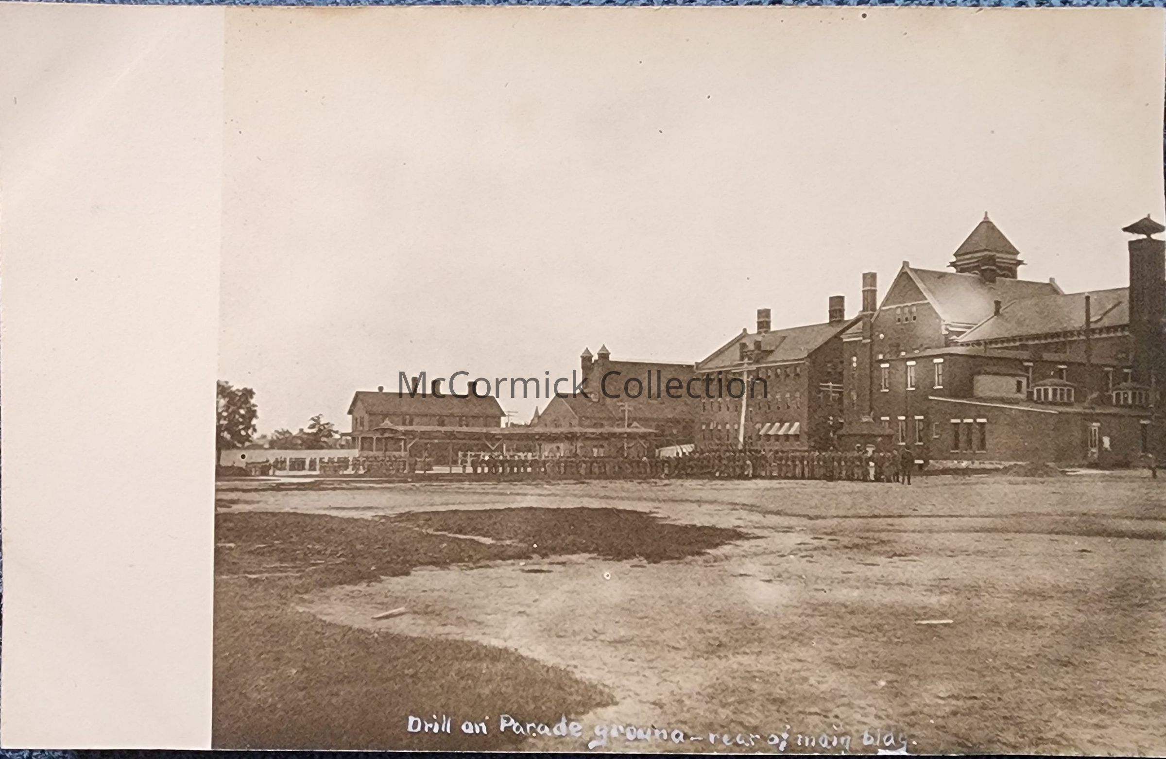 Real photo postcard of the drill and parade grounds at the rear of the main building, Boys Industrial School, Lansing, Michigan. Postally unused.