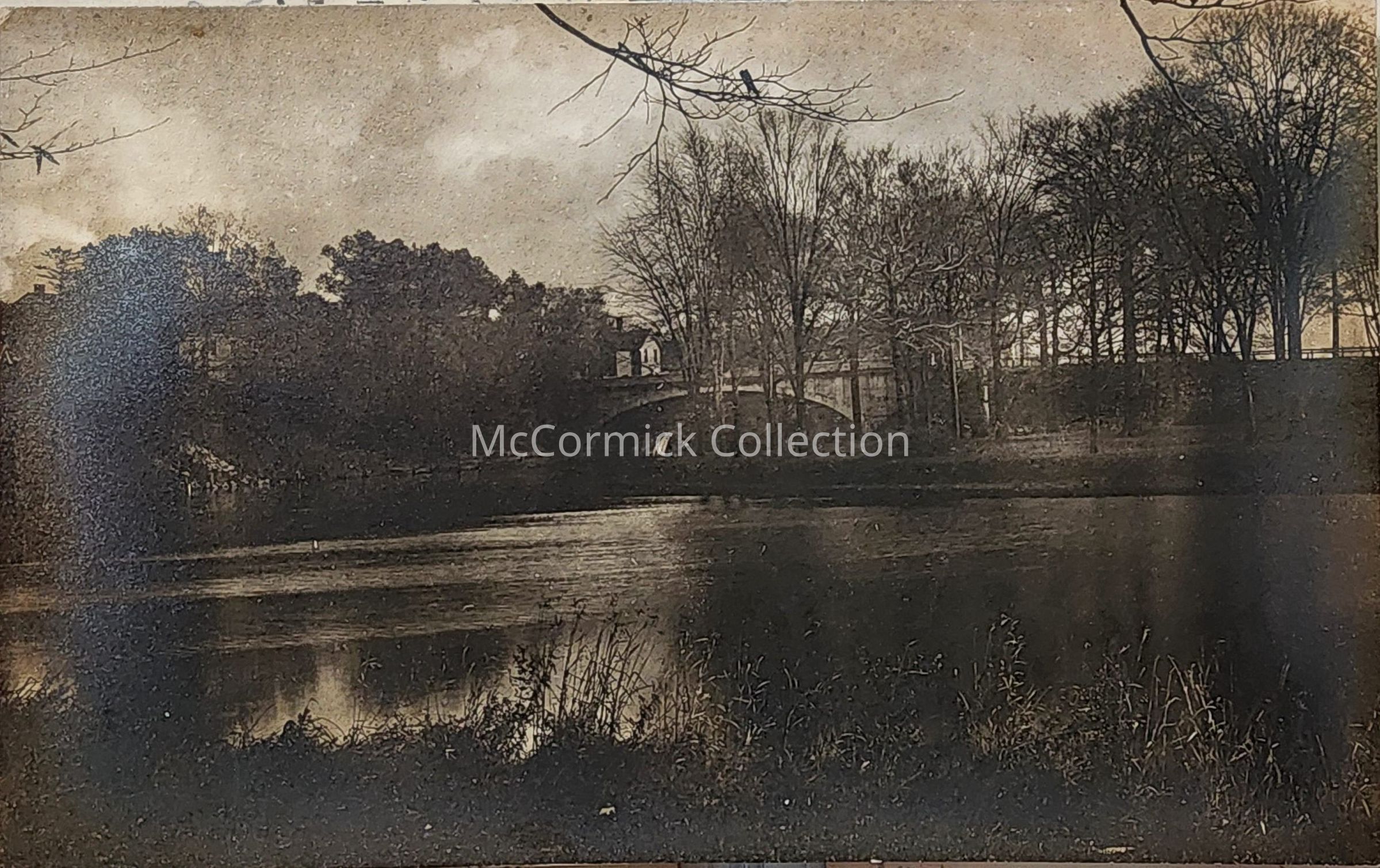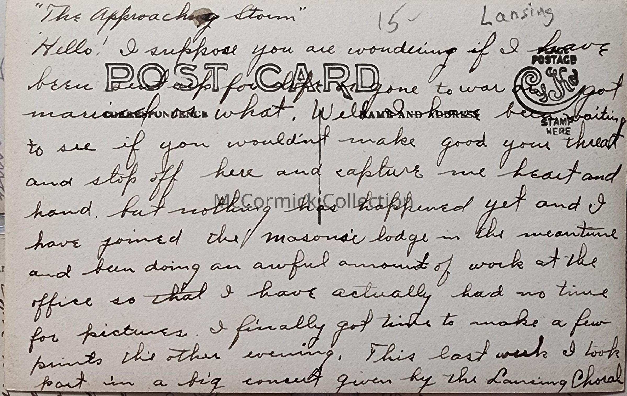 Real photo postcard of a bridge over the Grand River in Lansing, Michigan. Postally unused. This photo is titled "The Approaching Storm" and the back note is written by the photographer.
