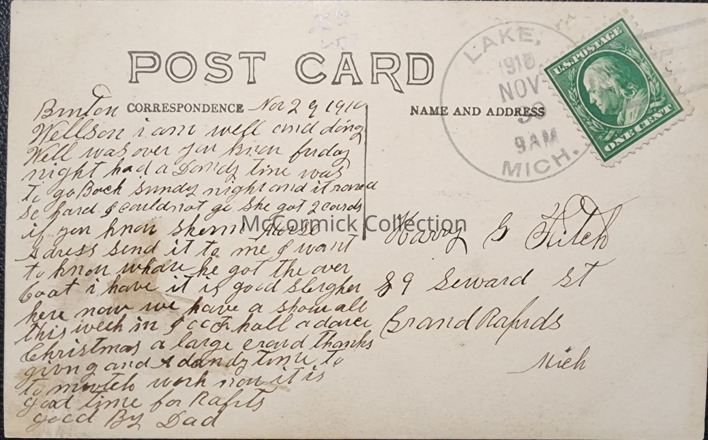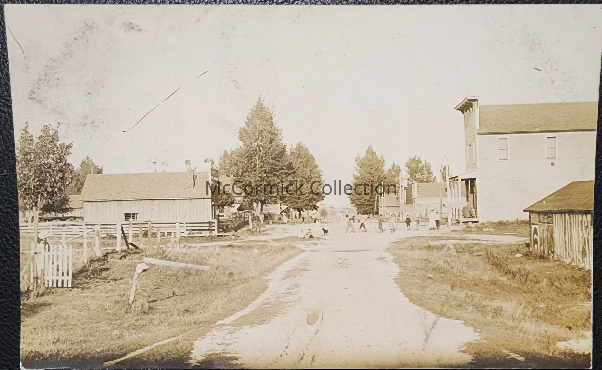 Real photo postcard of downtown Brinton, Michigan, now a ghost town. Postally used, 1910 Lake postmark. Located south of Lake in Isabella County.