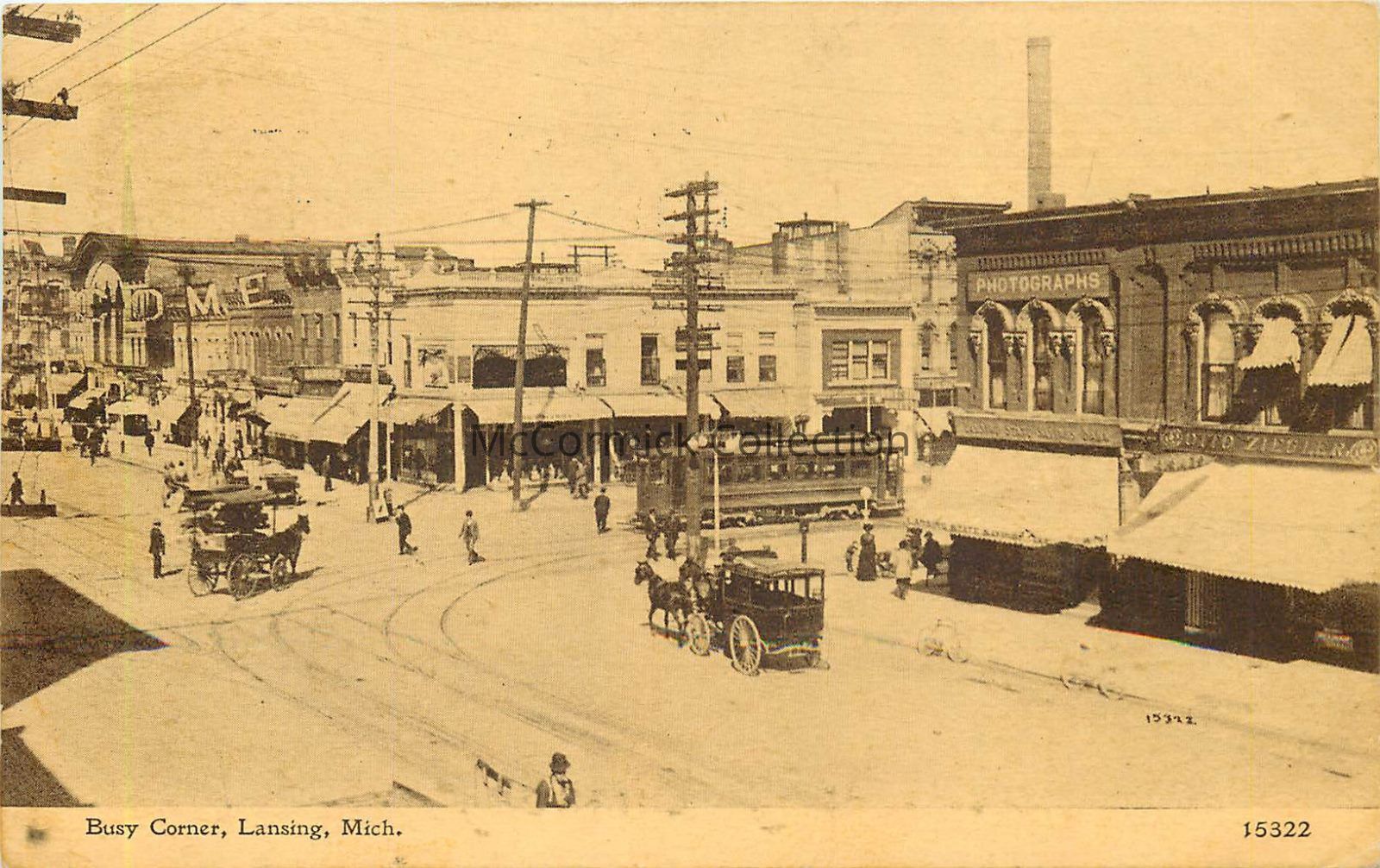 A postcard, circa 1915, of the corner of Washington and Michigan in downtown Lansing. Shown on the right is the photography studio consistently located at the southeast corner of that intersection from the 1860s through 1910s.