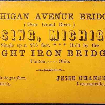 Stereograph of the Michigan Avenue Bridge over the Grand River in Lansing, Michigan. The back imprint of the card reads: "Michigan Avenue Bridge (Over Grand River,) Lansing, Michigan. Single span 215 feet. Built by the Wrought Iron Bridge Co., Canton, Ohio. B.F. Hall, Photographer, Lansing, Mich., Jesse Chance, Gen'l Agent, Vermontville, Mich." Pink card front mounting, back is yellow.