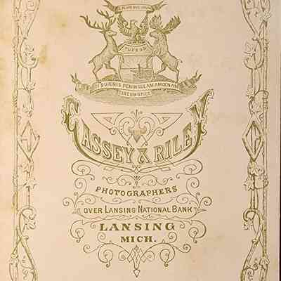 Cabinet card photograph of an unidentified man and woman by Lansing photographer Cassey and Riley.