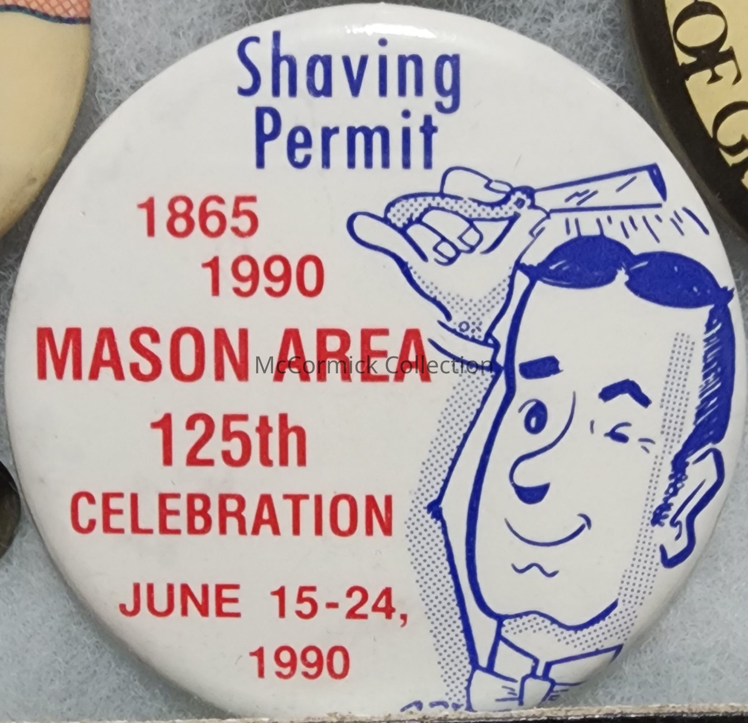 Button for a shaving permit from the 1990 Mason, Michigan, 125th anniversary celebration.