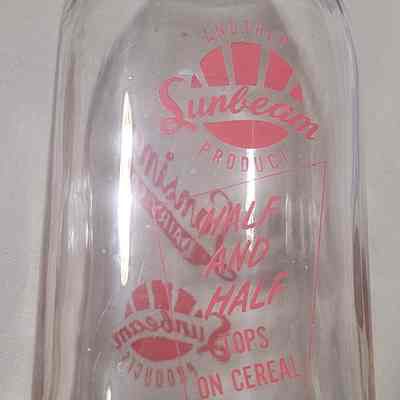 A square red pyro quart bottle from the Lansing Dairy Co. Has a "Sunbeam Products" seal on the front. The back slogan reads "Half and Half Tops on Cereal."