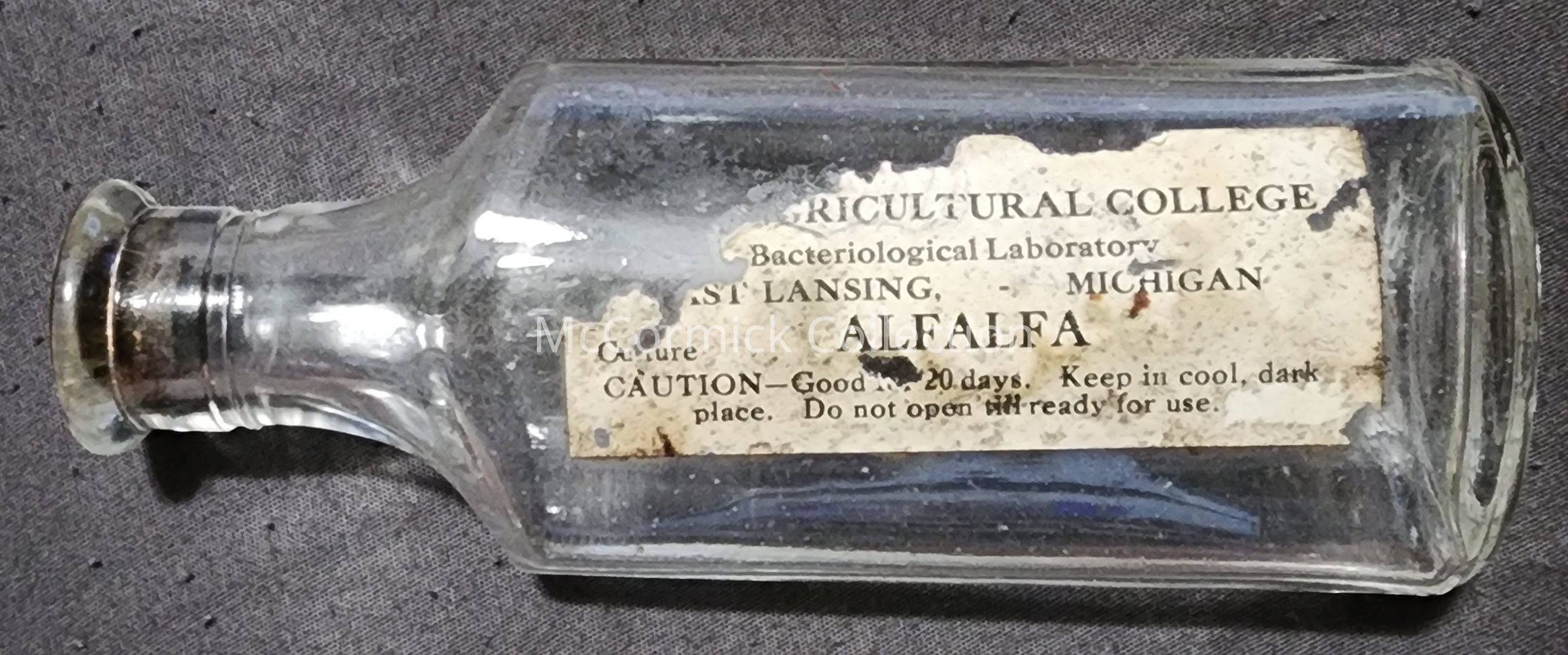 Small glass bottle from Michigan Agricultural College Biological Laboratory with a worn label for Alfalfa. Cork intact.