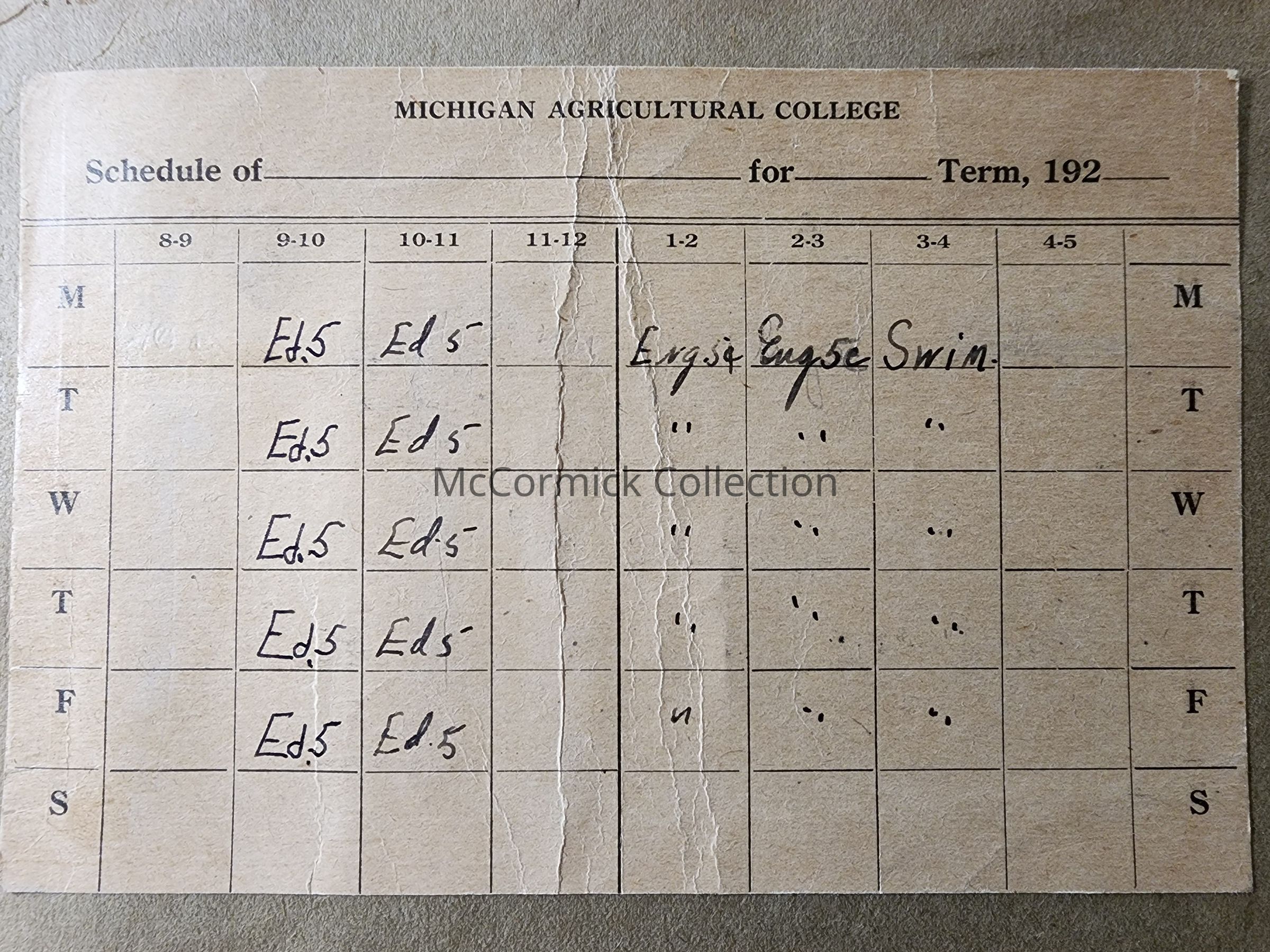 Schedule card for a student at Michigan Agricultural College in the 1920s. Attached to a single scrapbook page.