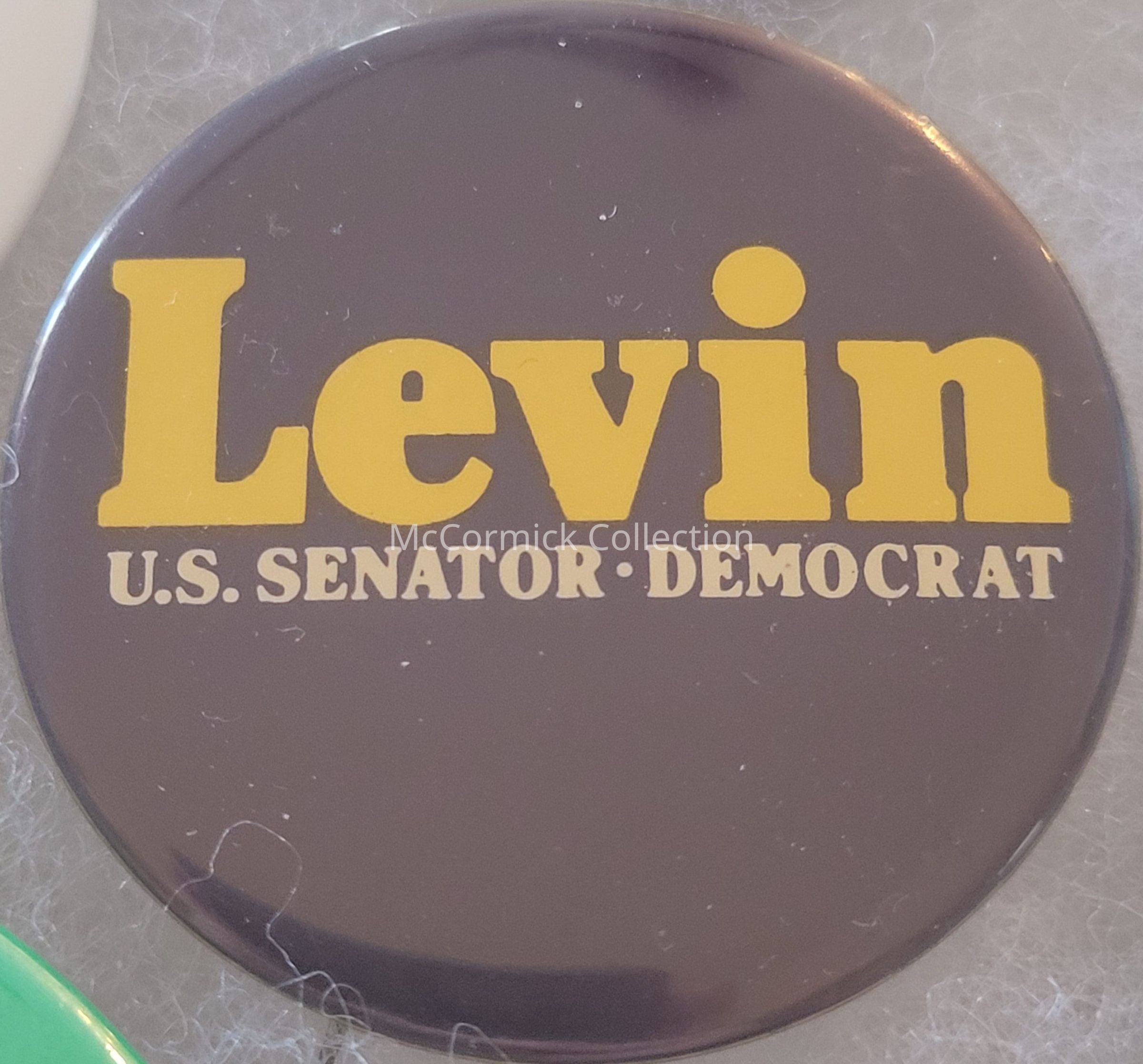 A 1.75" blue and yellow political button for Carl Levin for U.S. Senator, Democrat.