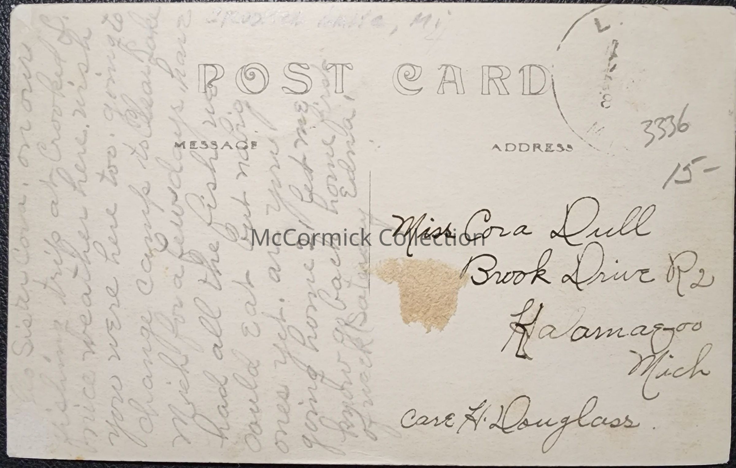 Real photo postcard of Camp Kaple Outing Club at Crooked Lake in Lake, Michigan. Postally used, Lake postmark. Addressed to Kalamazoo.