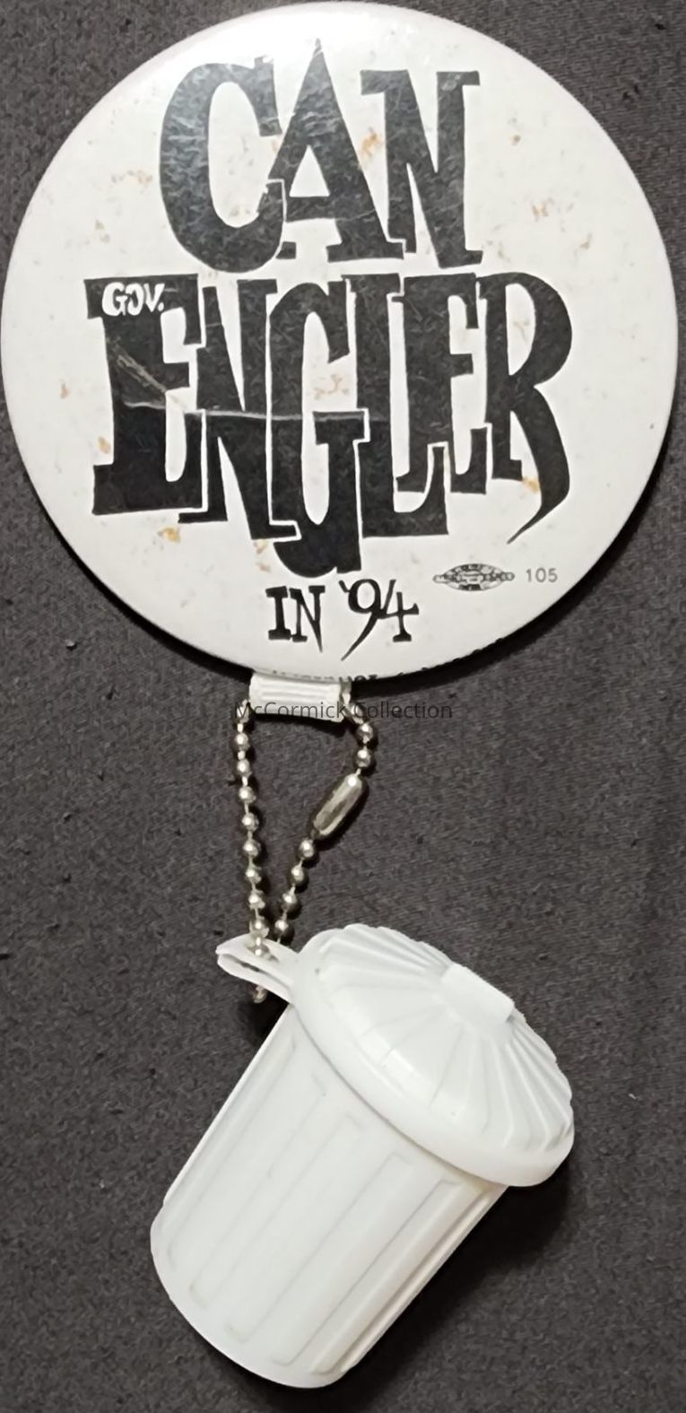 A 3" anti political button opposing Governor John Engler in 1994 with an attached plastic garbage can.