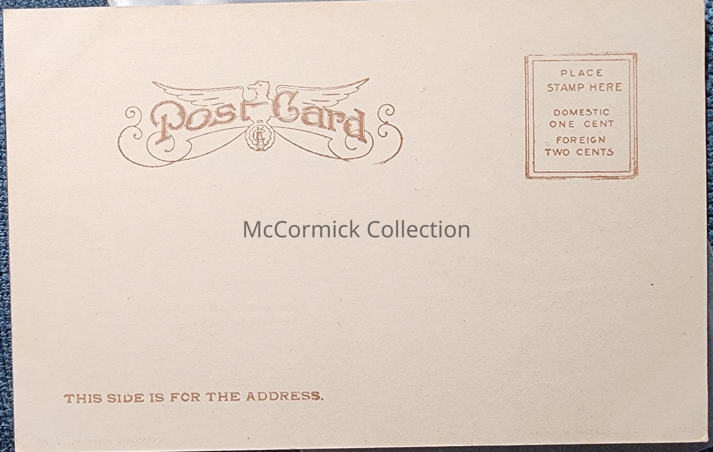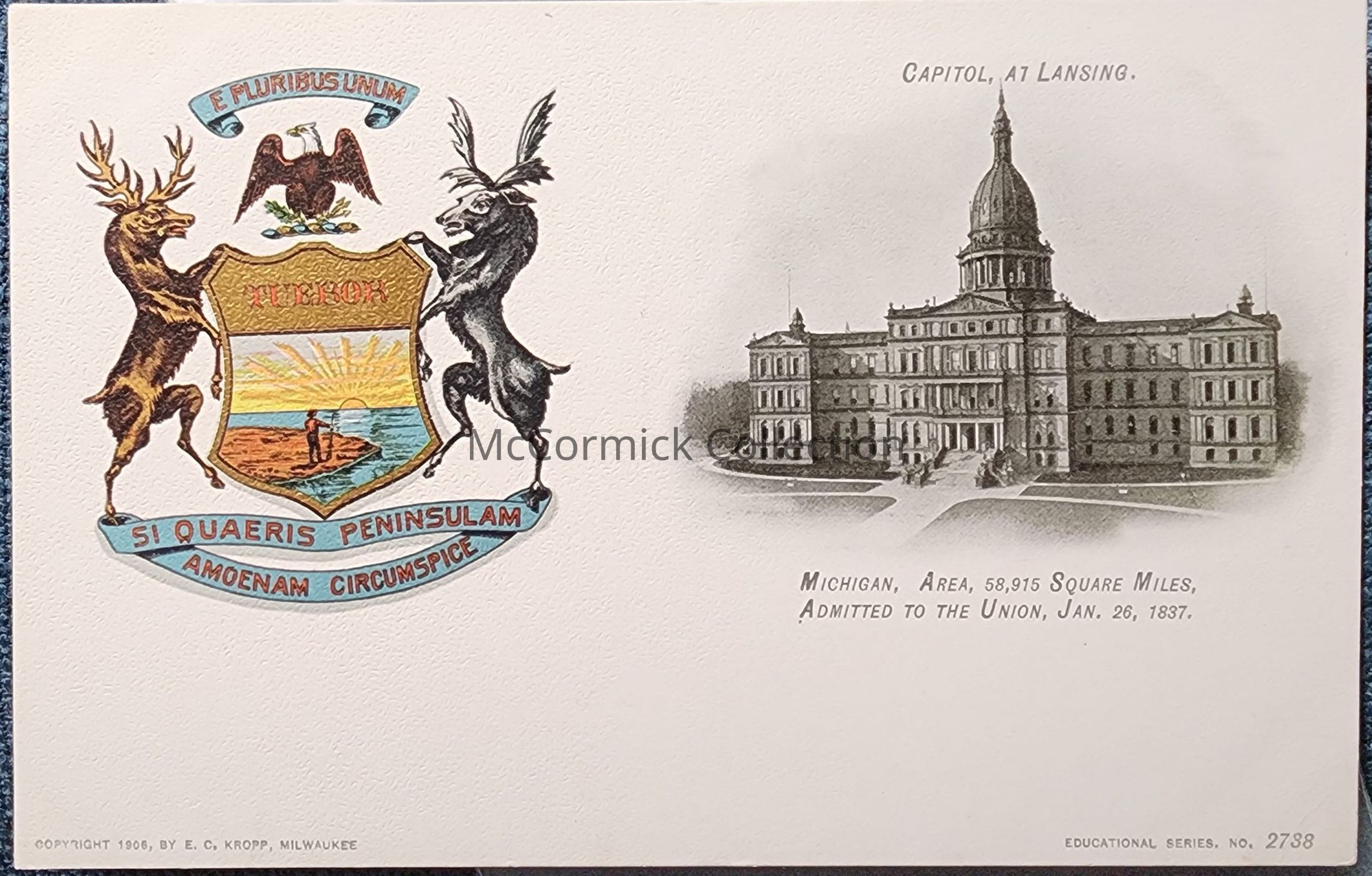 Postally unused postcard of the Michigan State Capitol with the state coat of arms, state seal.