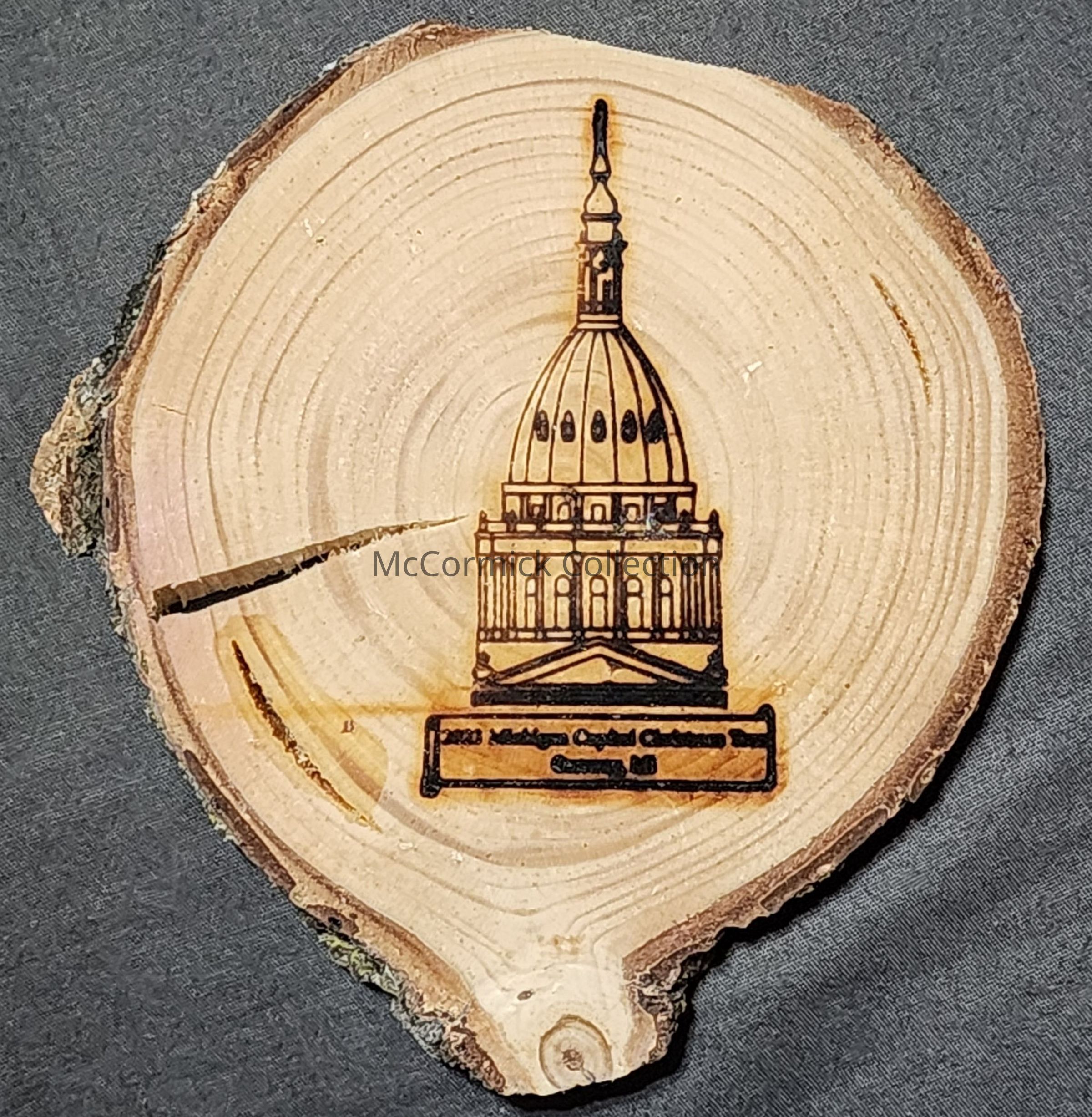 Coaster made from the top branch of the 2023 State of Michigan Christmas Tree at the State Capitol in Lansing.