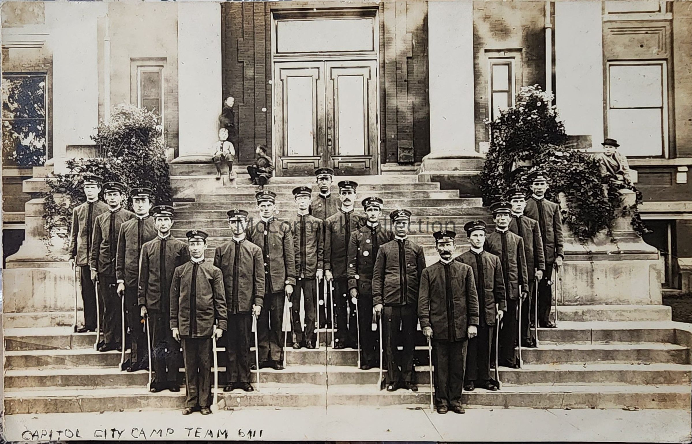 Real photo postcard of the Capitol City Camp Team 6411 posed on the steps of the Carnegie Library in Lansing. By Bovee. Potally unused.