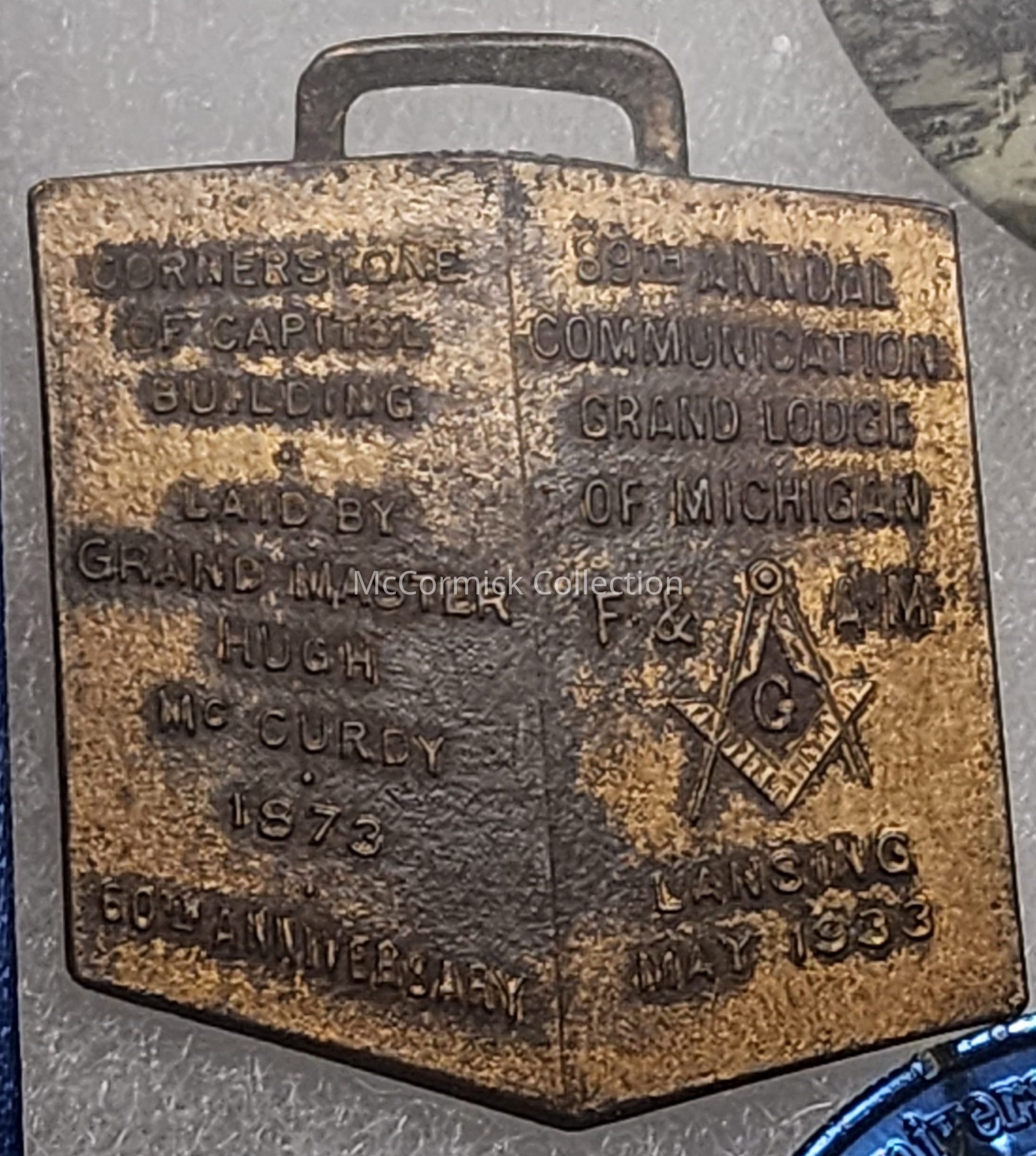 Metal medallion reading "Cornerstone of Capitol Building / Laid by Grand Master High McCurey 1873 / 60th Anniversary / 89th Annual Communication Grand Lodge of Michigan / F & AM / Lansing / May 1933."