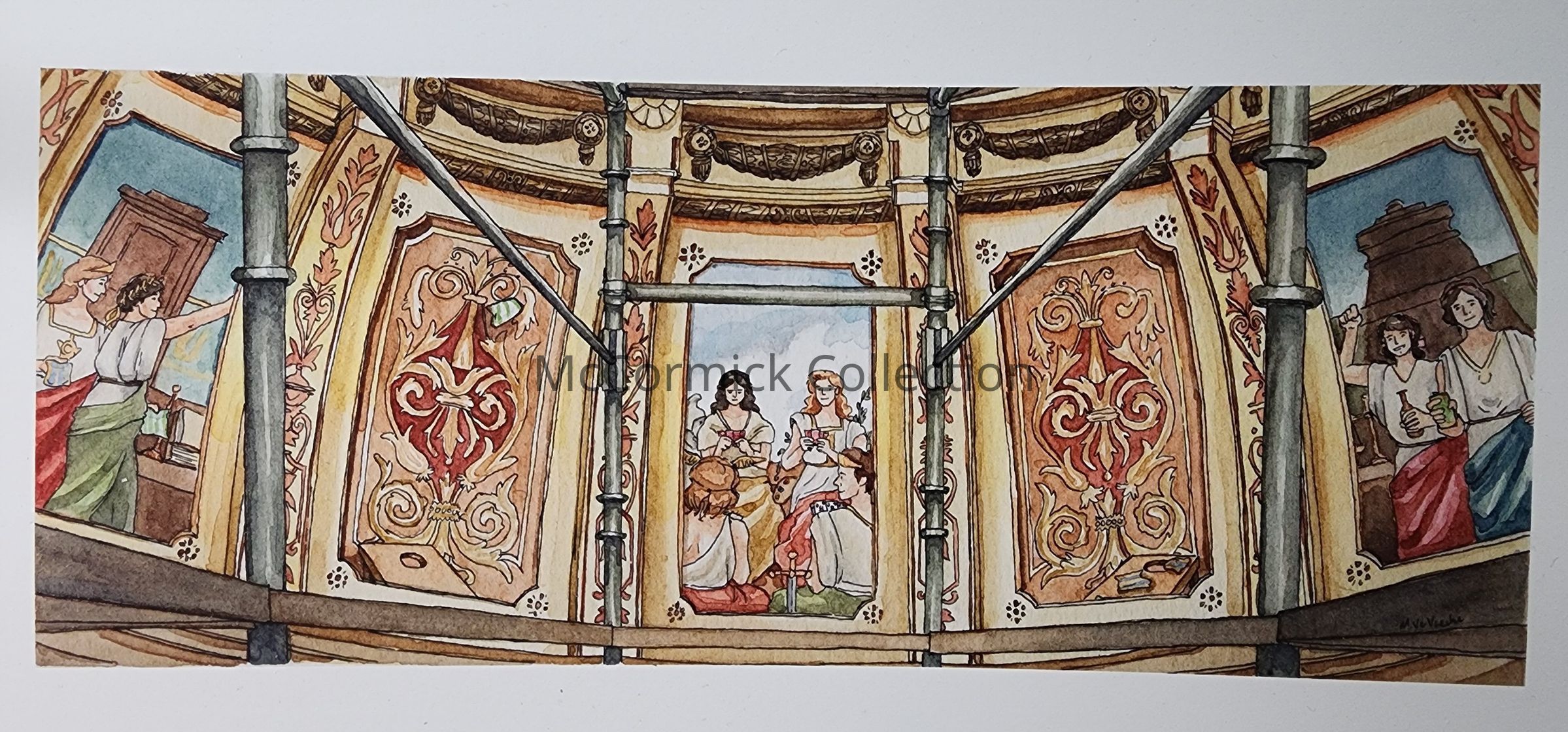 Watercolor art print by Maddy VerVaecke done in 2024 during the Capitol rotunda restoration. Titled "Capitol Ladies Night," it features the Capitol's allegorical Muses taking time off, playing cards and drinking while they're off public view.