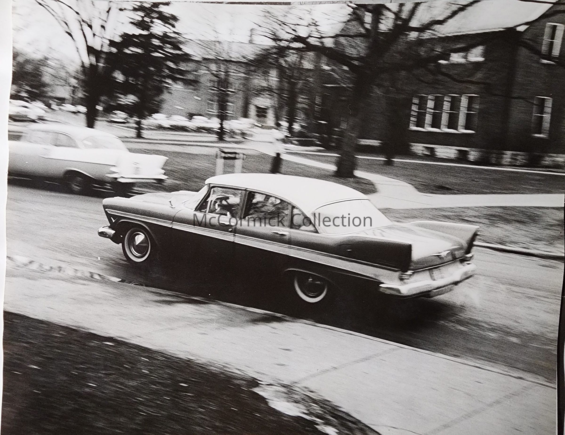 A snapshot photograph of a car driving down a road on the campus of Michigan State University. Circa 1950s-60s. From Siebert Estate.