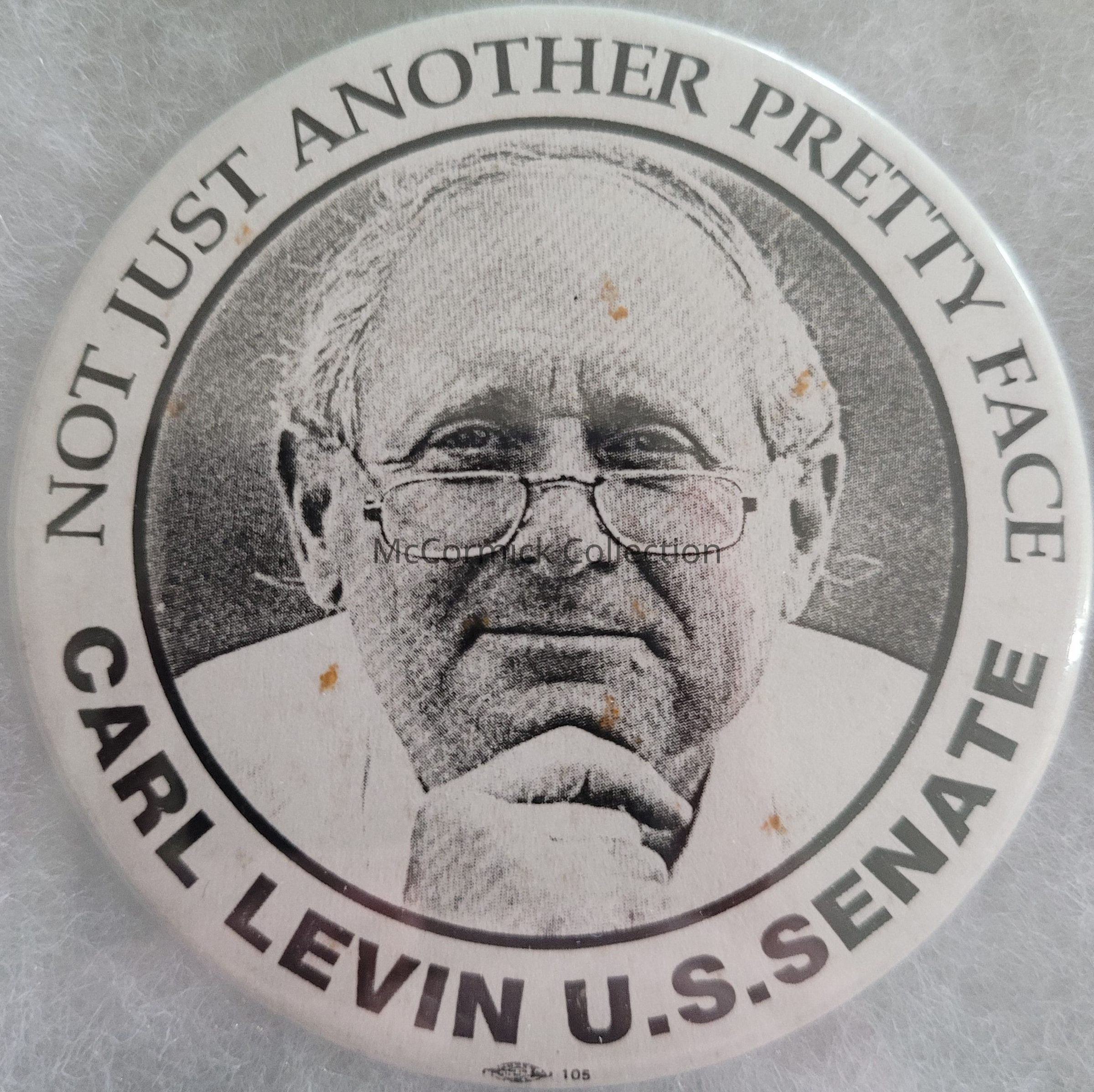 A 3" black and white picture button from a reelection campaign for U.S. Senator Carl Levin with the slogan "Not Just Another Pretty Face." Circa 2000s.