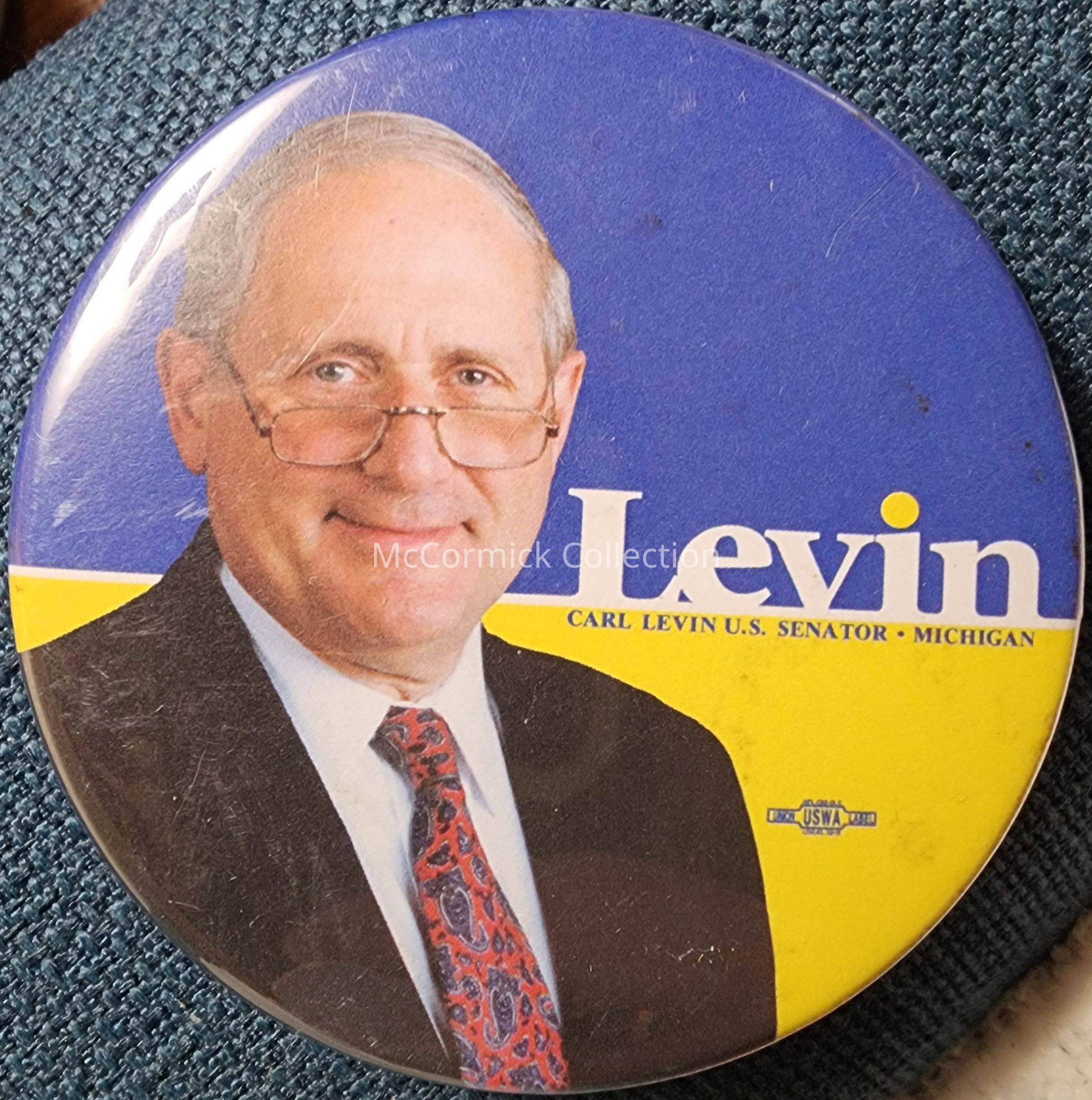 Political button, 3", with a color photo and blue/yellow/white color scheme for Carl Levin's campaign for United States Senator.