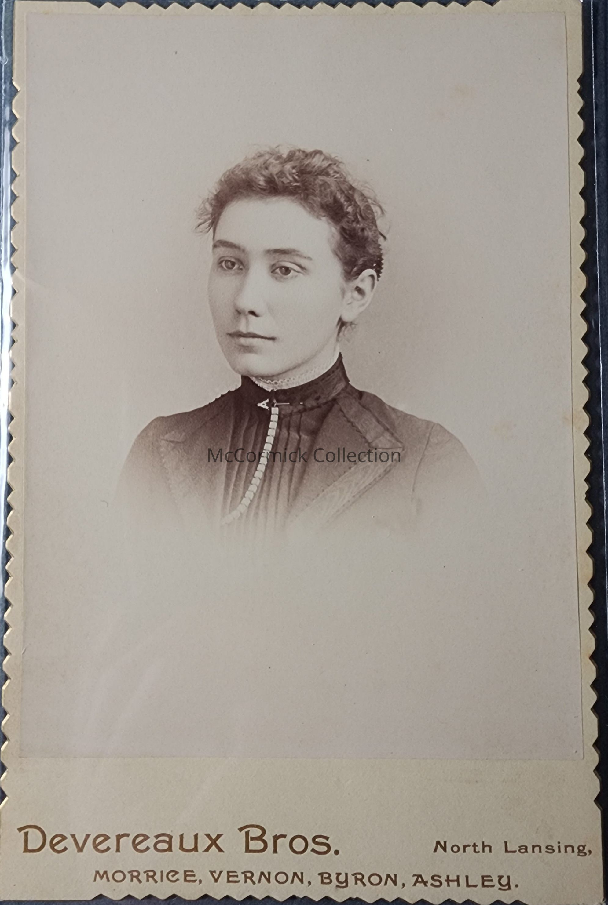 Cabinet card photograph of Carrie Arthur by North Lansing photographer Devereaux Bros., who also had studios in Morrice, Vernon, Byron, and Ashley. Circa .