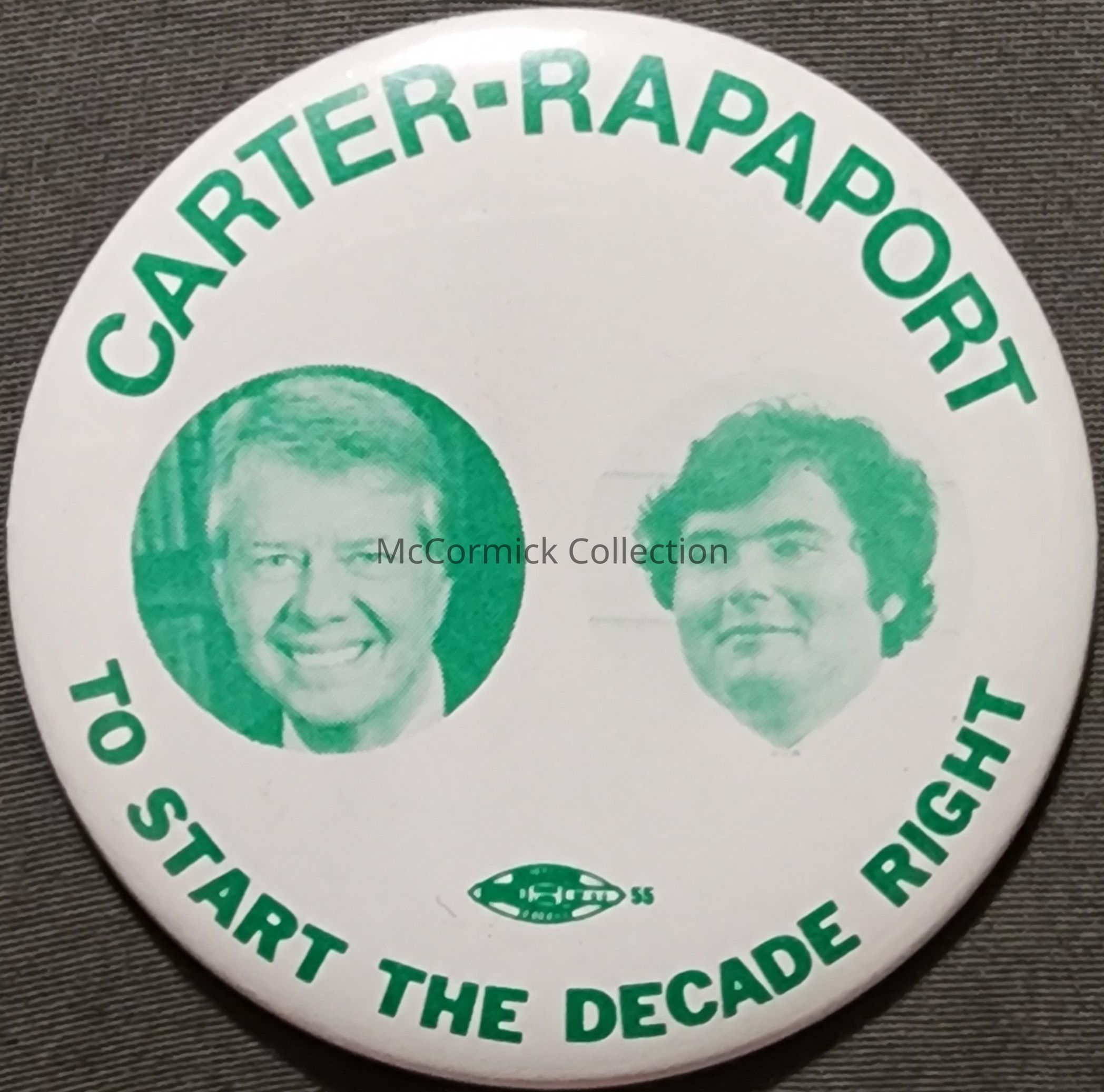 A 2.25" green and white jugate local coattail button for Jimmy Carter for President and Roger Rapaport for Sixth District Ingham County Commissioner, 1980. Rapaport had few of these buttons made, making them scarce. Slogan is "To Start the Decade Right." Made locally in Lansing by A. Dean Watkins.