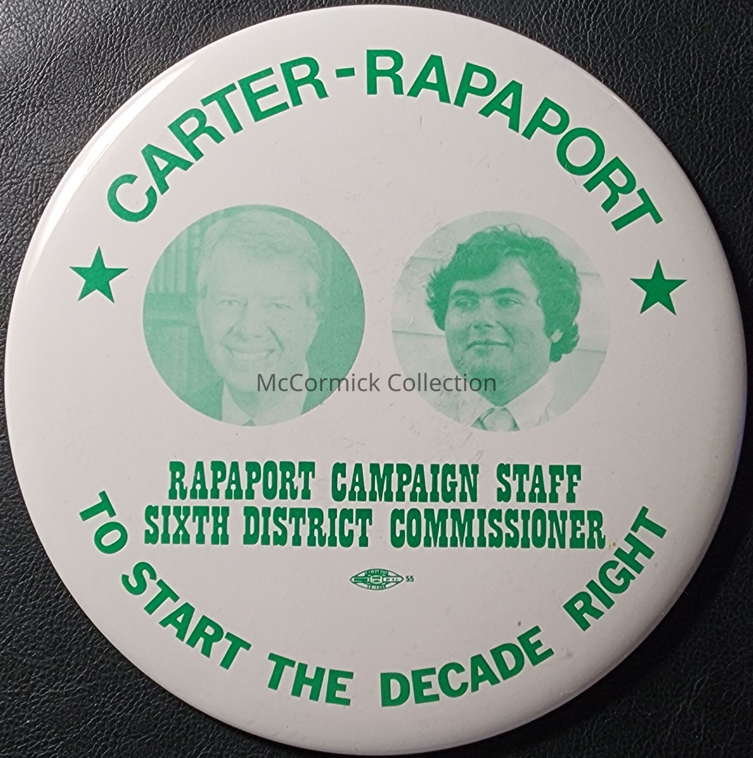 A 6" green and white rare jugate local coattail button for Jimmy Carter for President and Roger Rapaport for Sixth District Ingham County Commissioner, 1980. Rapaport had 12 of these 6" buttons made, making them quite rare.